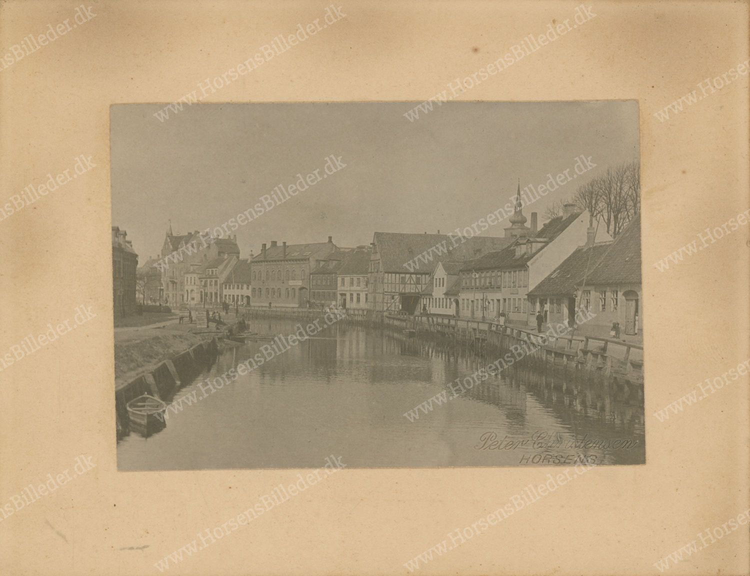 Åen inden opfyldningen set vest. Frelserkirkens spir ses til højre og pakhuset ved Badstuestræde bagved. Indrammet af Glarmester Johan Norup, Hj. af Torvet og Borgergade, Horsens. Fotograf Peter (Peder) Christensen, Horsens. Udlåner Frank Miller.