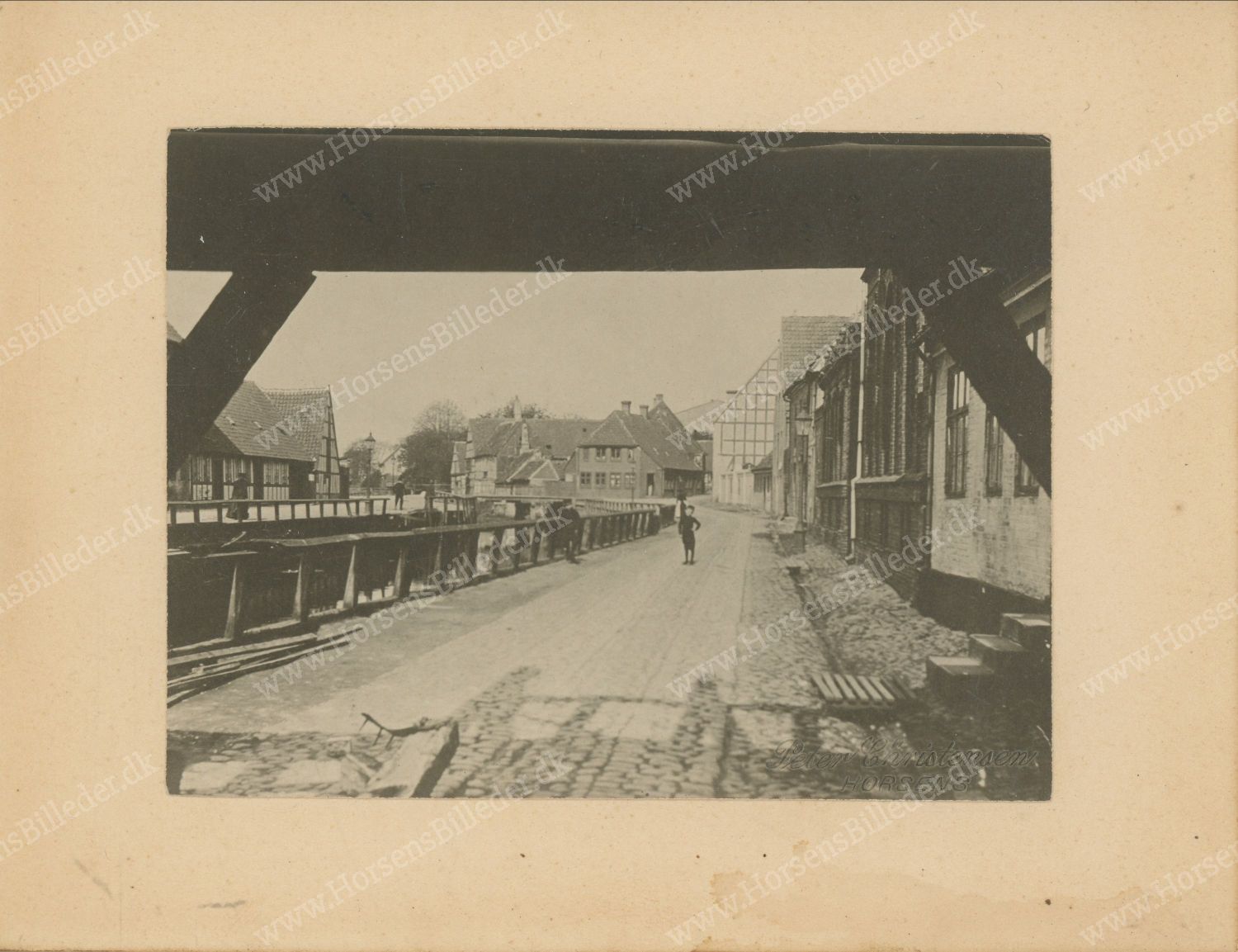 Udkig fra det nedrevne pakhus set mod Vandborg, Pjaltenborg eller Storkereden. I dag Rådhustorvet. Indrammet af Glarmester Johan Norup, Hj. af Torvet og Borgergade, Horsens. Fotograf Peter (Peder) Christensen, Horsens. Udlåner Frank Miller.
