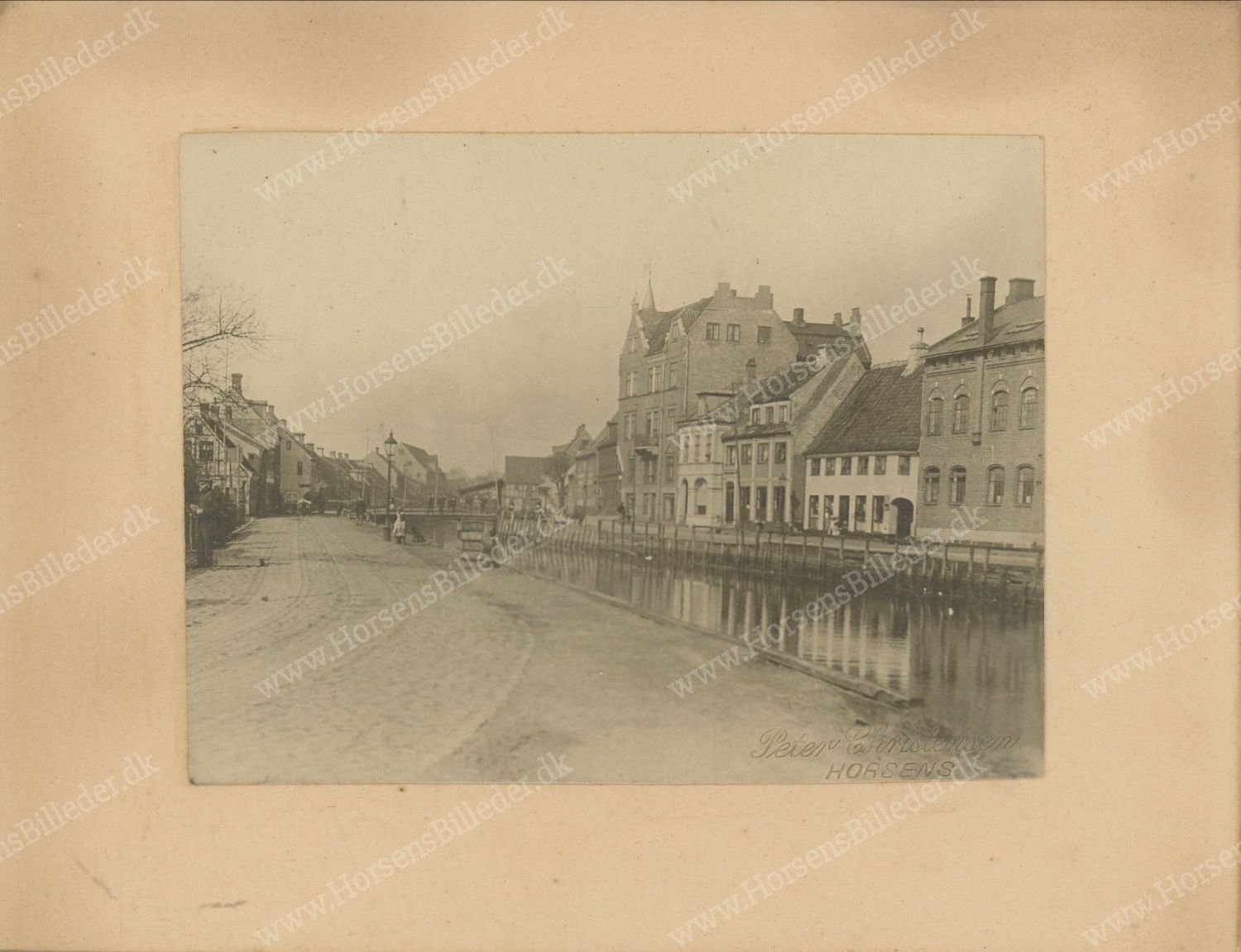 Sønderaagade set mod Aagade. Fugholmbroen og pakhuset anes ved Rådhustorvet. Pakhuset blev revet ned i forbindelse med åopfyldningen. Indrammet af Glarmester Johan Norup, Hj. af Torvet og Borgergade, Horsens. Fotograf Peter (Peder) Christensen, Horsens. Udlåner Frank Miller.