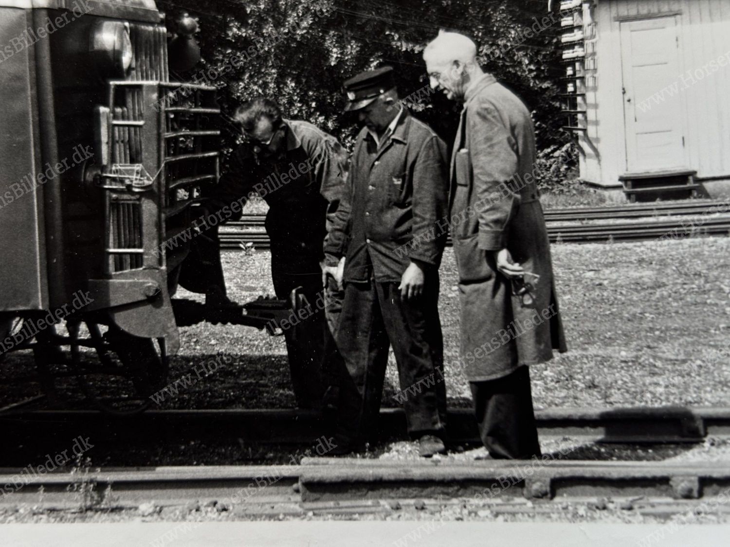 Til højre ses værkmester på Horsens Privatbaner, Herman Pedersen. Han var bosiddende på Kyradservej og var oprindelig udlært maskinarbejder hos Møller & Jochumsen i Horsens. Udlåneren, der er barnebarn fortæller at der nogle gange vankede en søndagstur på remisen og værkstedet, og det var et rent slaraffenland for en stor knægt, at kunne kravle rundt på de forskellige lokomotiver. Han skulle have været med til at afvikle privatbanen efter nedlæggelsen, men døde kort efter nedlæggelsen i en alder af 67 pga slid. Udlåner Johannes Roldsgaard. Greve.