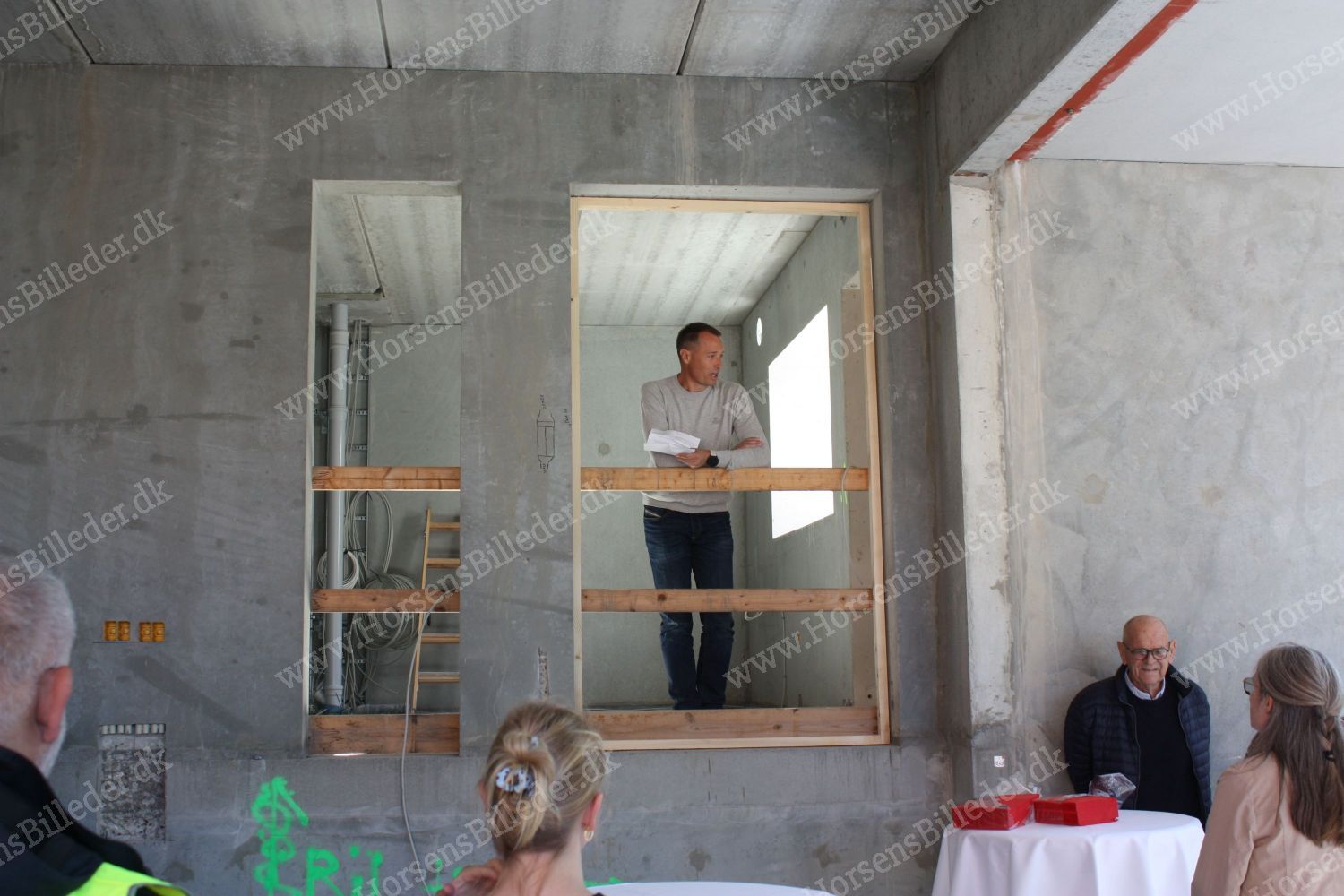 Her opfører PFA ejendomme 60 leje- og seniorboliger. Projektet indeholder 34 seniorboliger med mange fællesrum, herunder bl.a. værksted, fælleslokale og weelness afdeling, samt 26 boliger med 2-3 værelser - alle med altaner. Bygherren: PFA ejendomme. Bygherrerådgiver: KUBEN Management. Totalentreprenør: CJ AS. Arkitekt: Laban Arkitekter A/S. Ingeniør konstruktioner: Fjord Rådgivende Ingeniører A/S. Ingeniør Installationer: Ubbe Rådgivende Ingeniører A/S. Der var rejsegilde den 25. september, hvor ca. 120 deltog. Her taler Troels Andersen, Partner CJ A/S - Anlæg - Bolig - Erhverv. Den 25/9-2025. Udlåner Jan Østergaard Andersen.