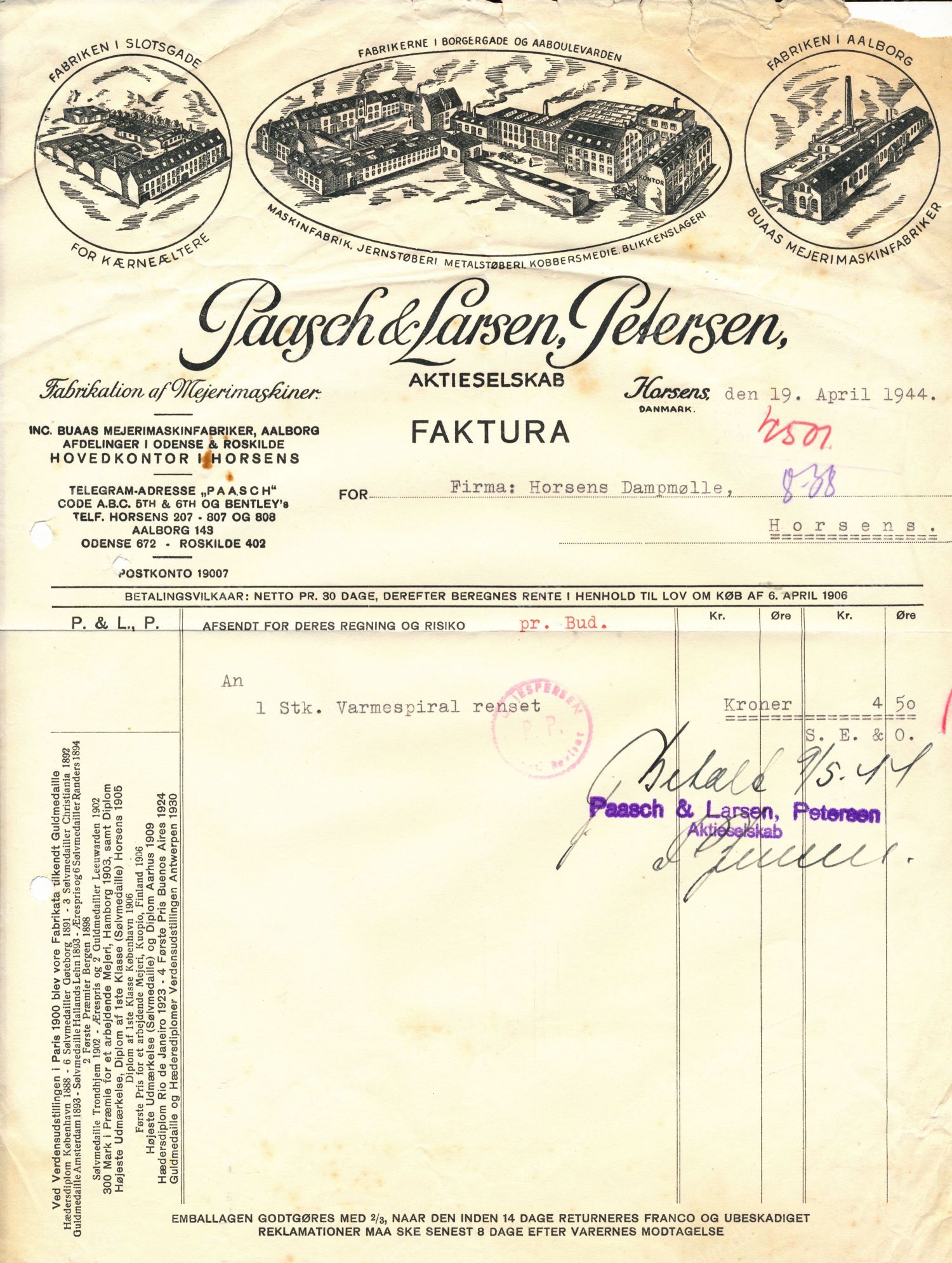 Faktura fra Paasch & Larsen, Petersen til Horsens Dampmølle. Udlåner Jan Østergaard Andersen.
