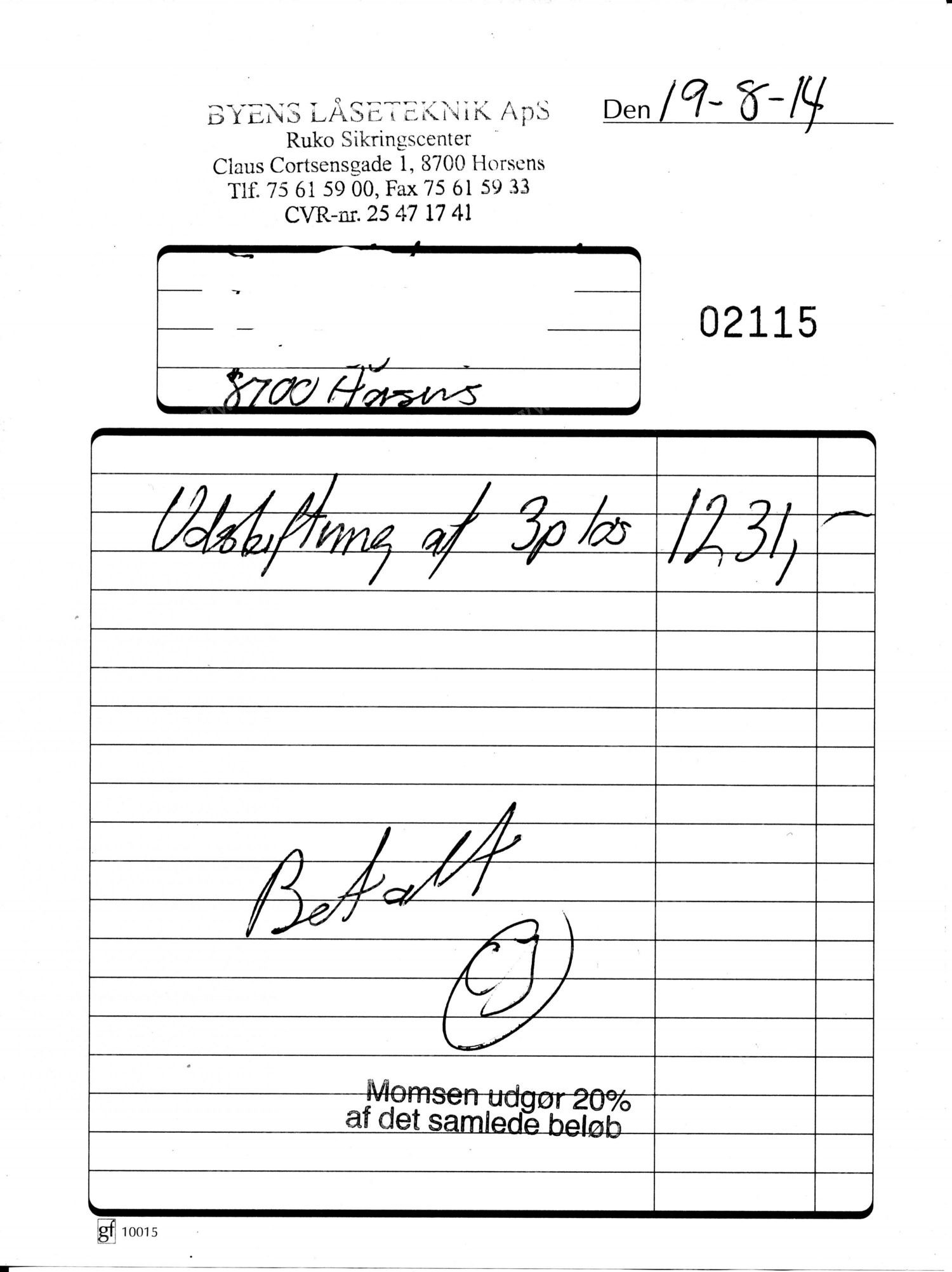 Regning fra Byens Låseteknik. Udlåner Jan Østergaard Andersen.