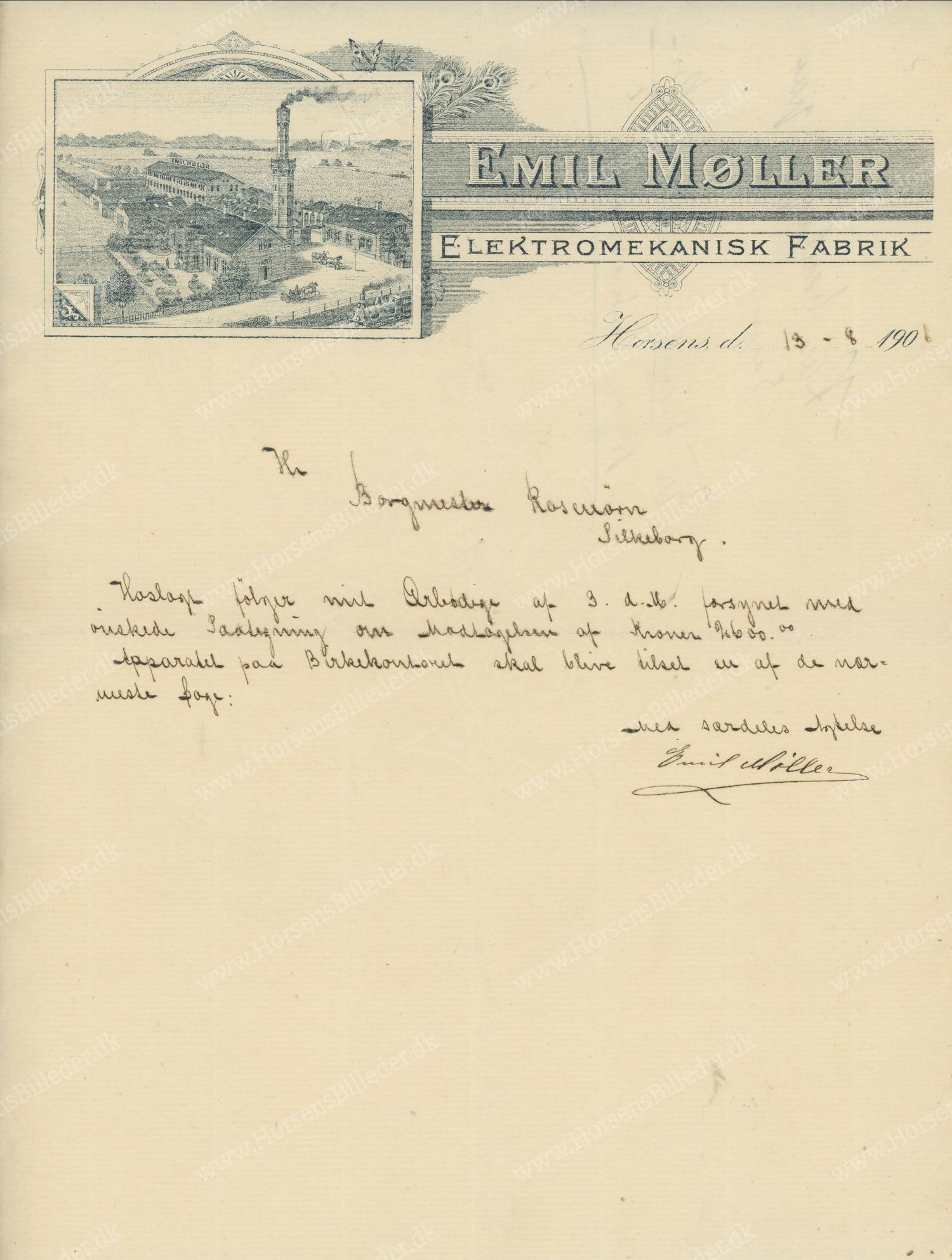 Brev fra Emil Møllers Elektroniske Fabrik ca. år 1900-1910. Underskrevet af Emil Møller. Udlåner Frank Miller.