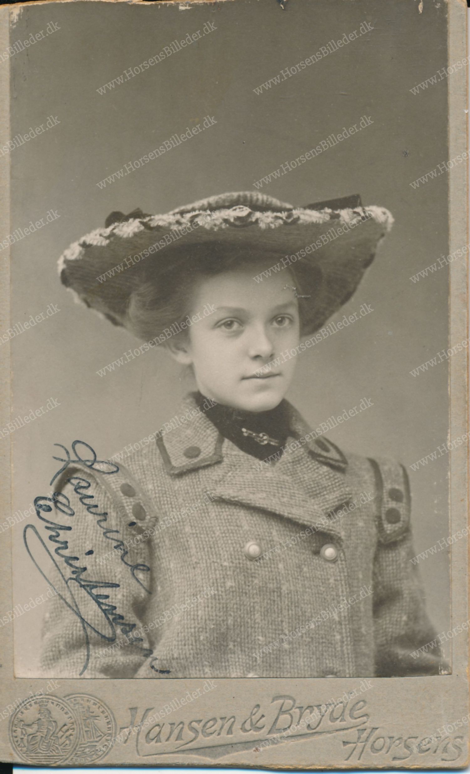 Fotoet er taget hos fotograf Hans Hansen & Niels Bryde. Graven 1 - 5, Theater passagen. Udlåner Jan Østergaard Andersen. På billedet står: Legekammerat Laurine Christensen. Døde i sommeren 1905, 17 år gl. Samme familie 0010. Udlåner Jan Østergaard Andersen.