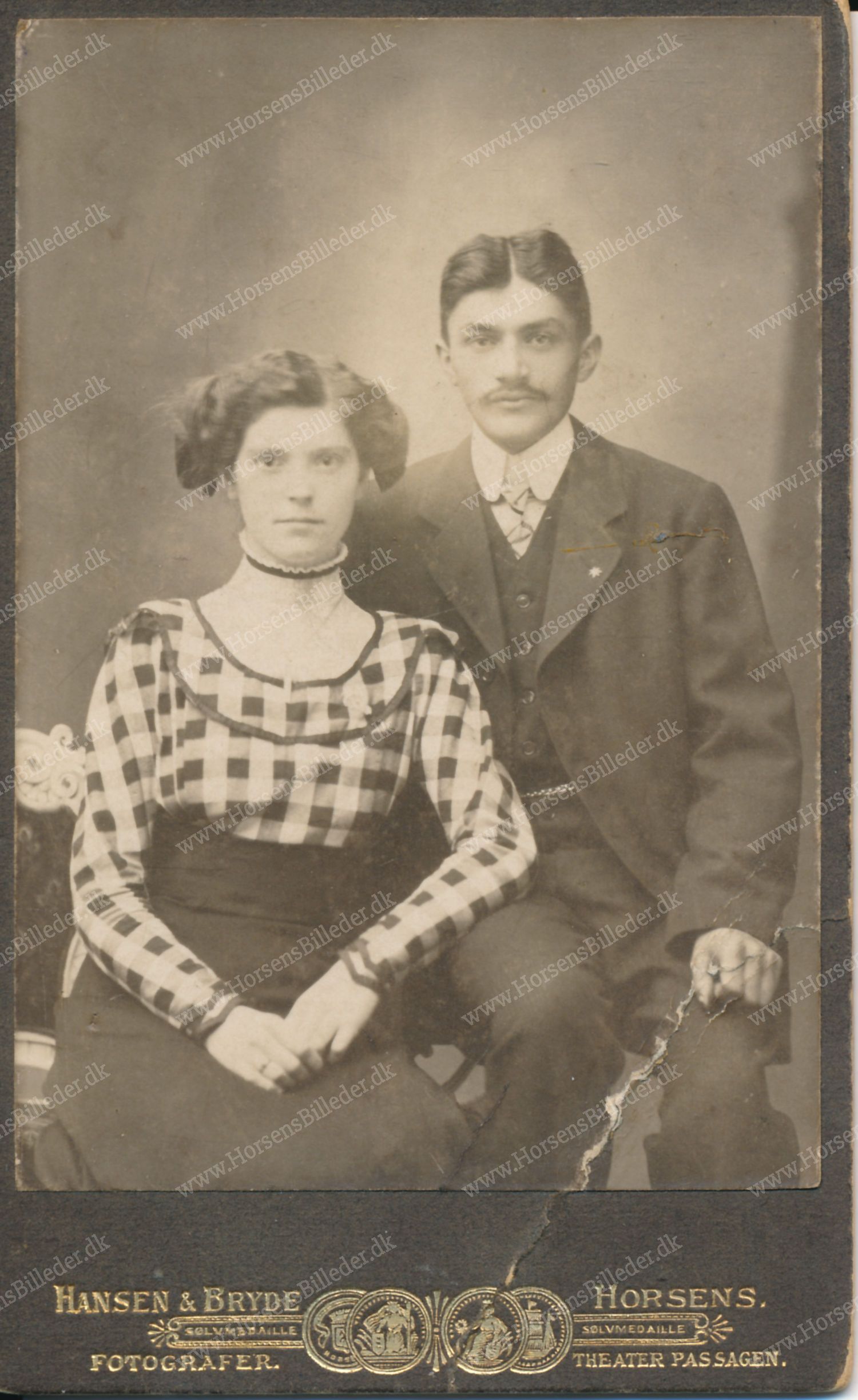 Fotoet er taget hos fotograf Hans Hansen & Niels Bryde. Graven 1 - 5, Theater passagen. Udlåner Jan Østergaard Andersen. På billedet står: Julle og Alfred. Julen 1909. Min bror og svigerinde. Emils, Vitus og Ebbas forældre. Samme familie 0010. Udlåner Jan Østergaard Andersen.