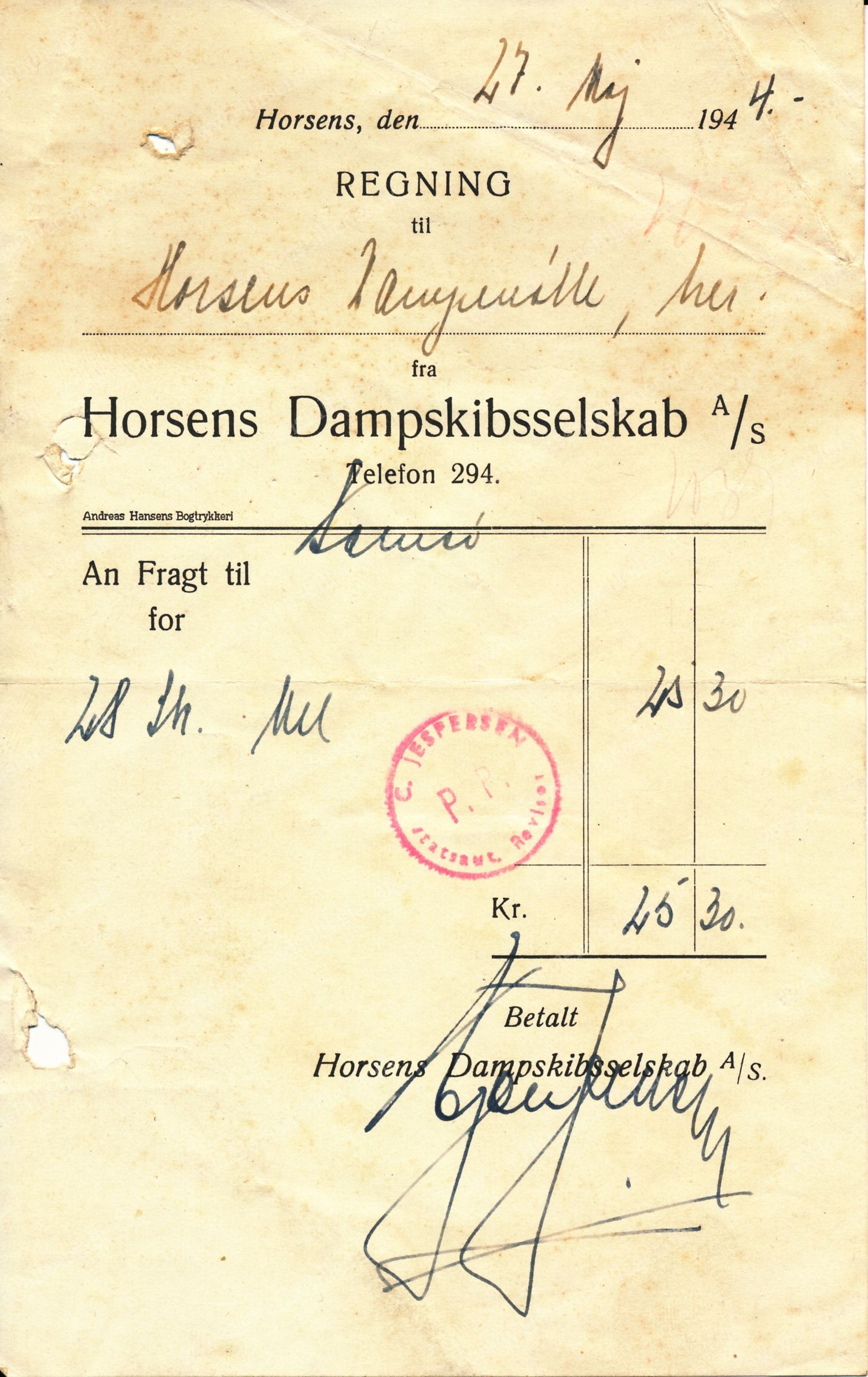 Regning fra Horsens Dampskibsselskab til Horsens Dampmølle. Udlåner Jan Østergaard Andersen.