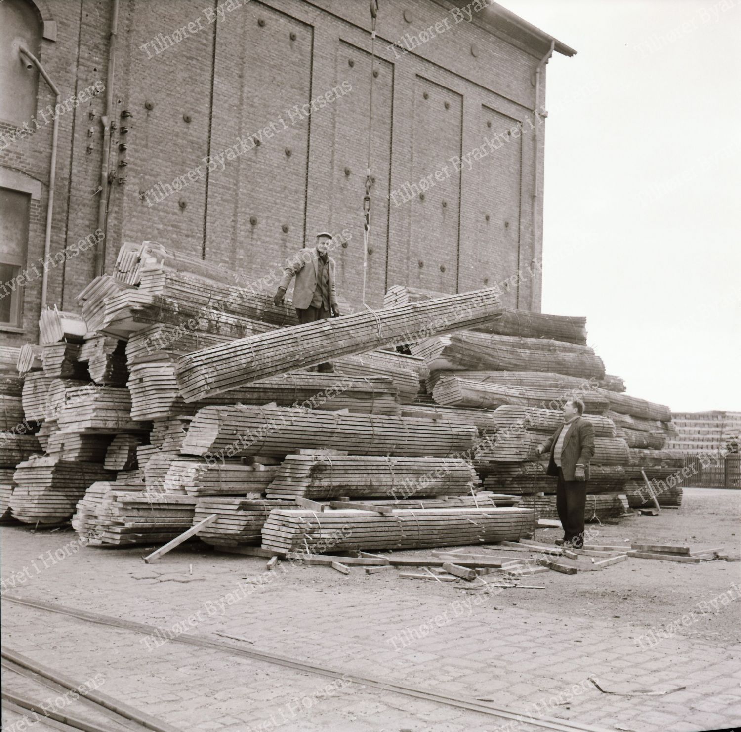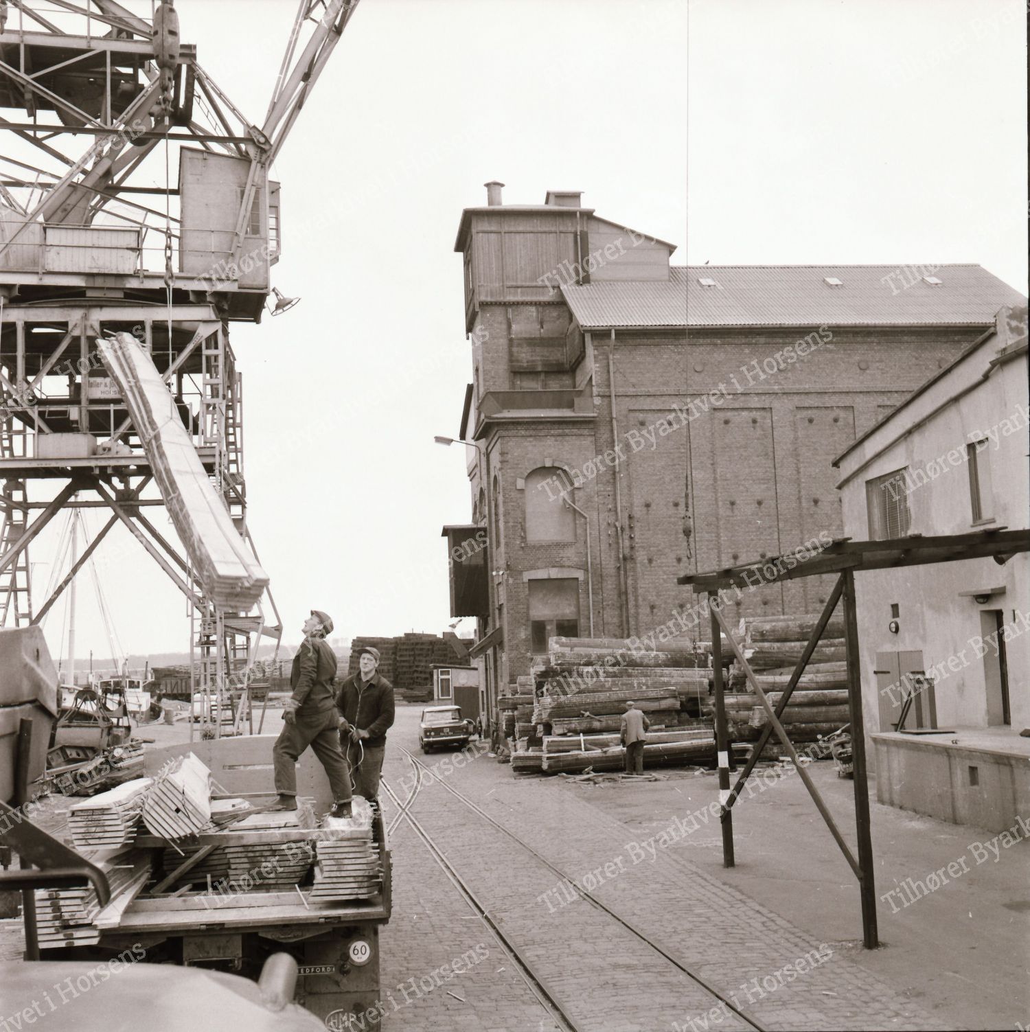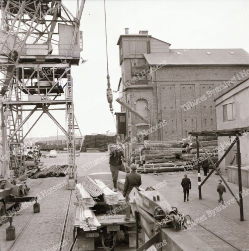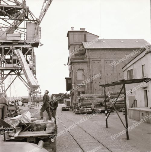 16/64. Stor træeksport fra Hovedgaard Savværk. Her på Havnen. HF 14/4-64.