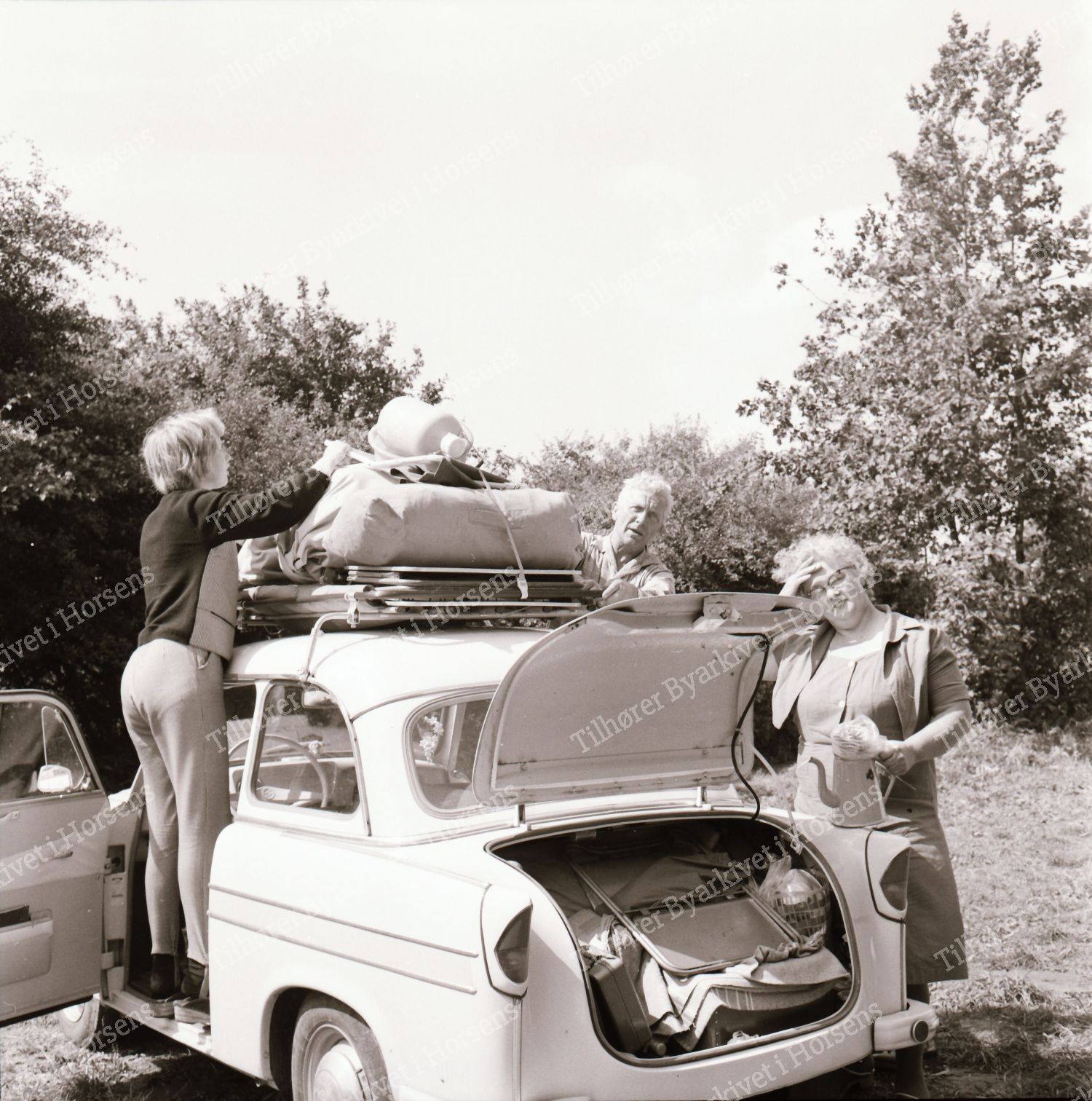 28/64. Pause i regnvejret. Københavnerfamilie tager hjem fra Husodde. HF 10/7-64.