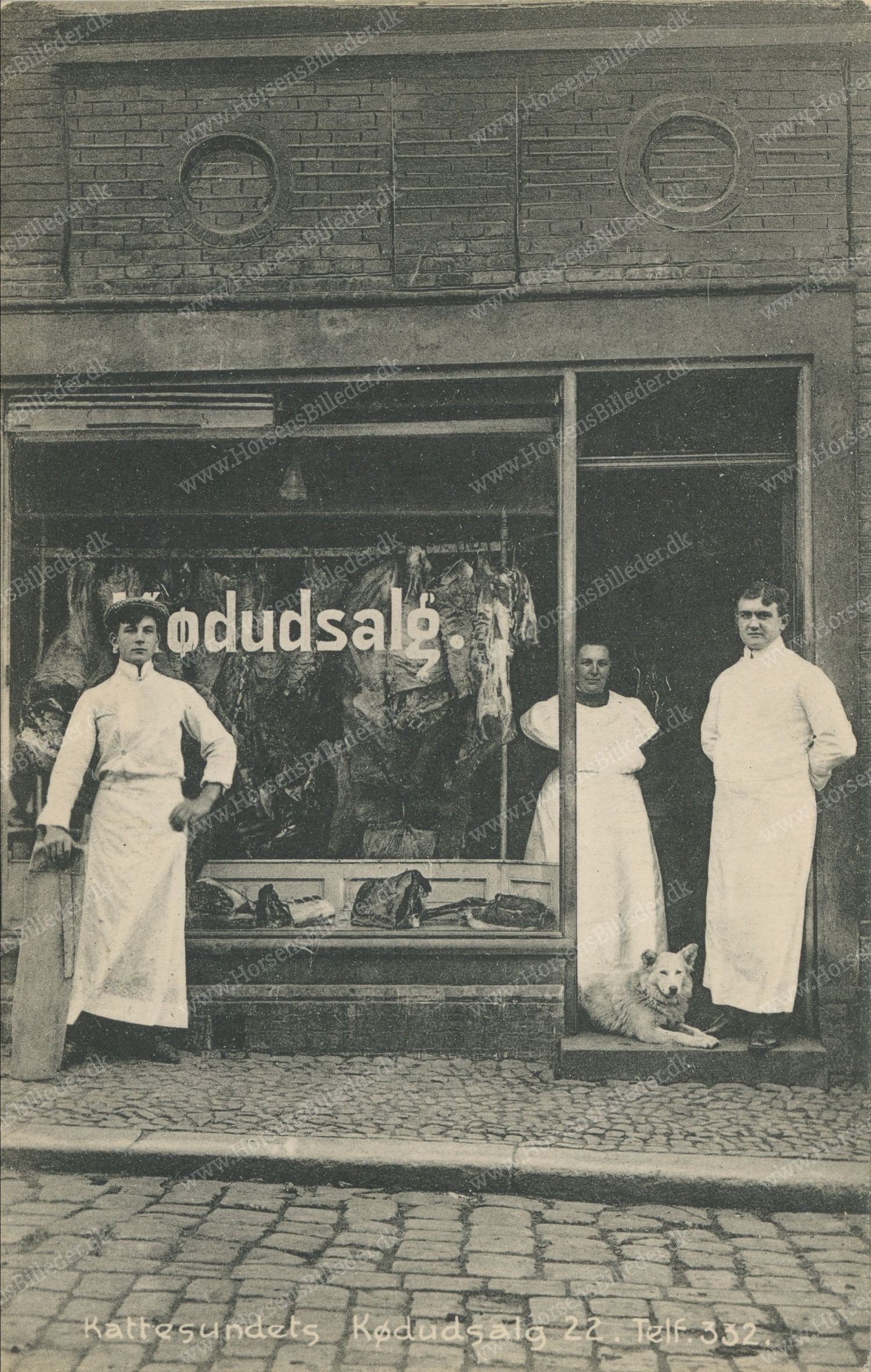 Kattesund 22. Kødudsalg med formentlig Rasmine Madsen med et par af sine sønner. Hun fortsatte forretningen efter sin mands død formentlig fra omkring 1908 da hun ses i vv 1909-10. Postkort Frank Miller.