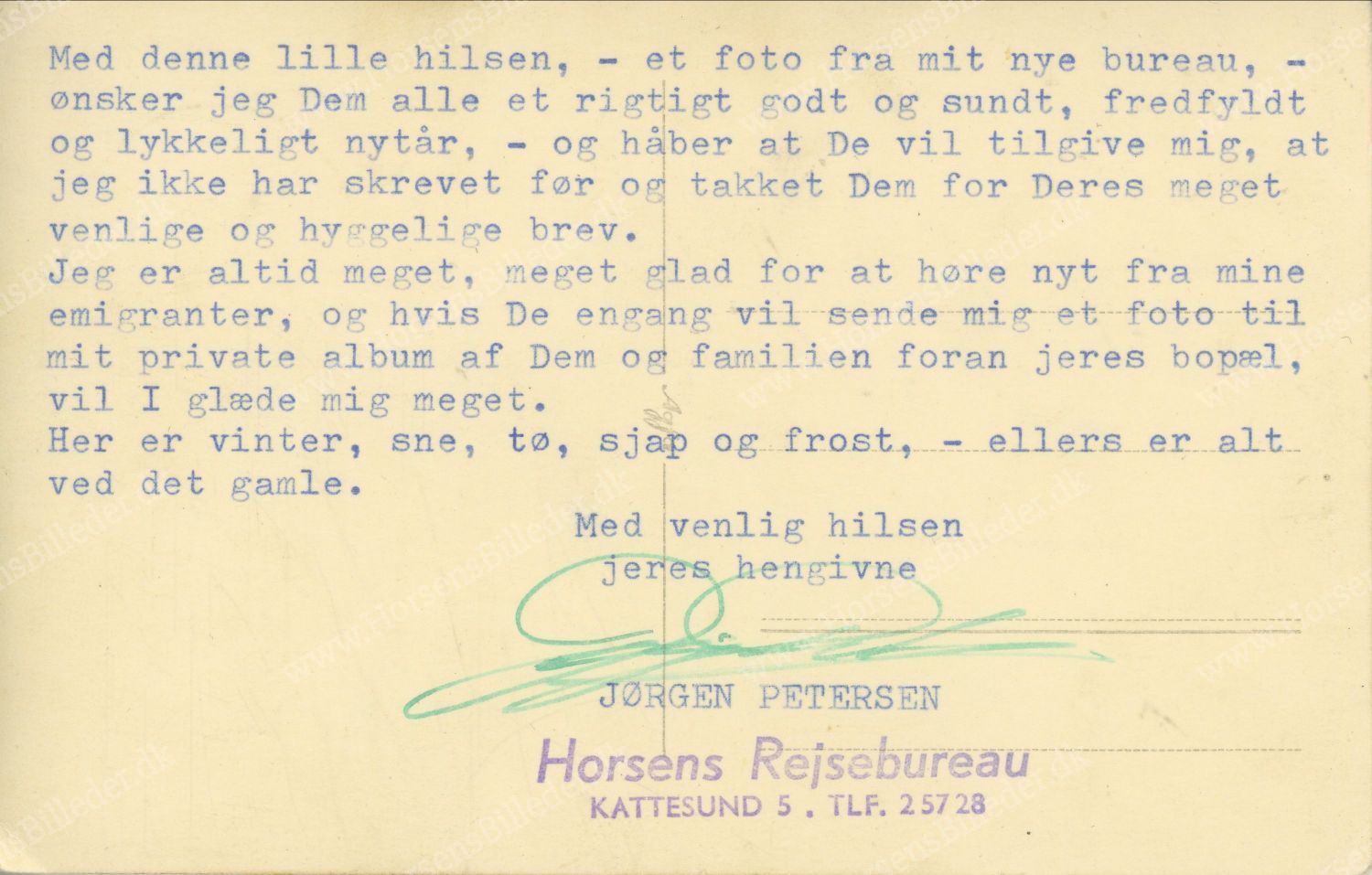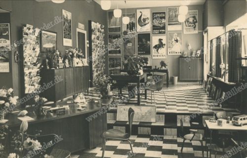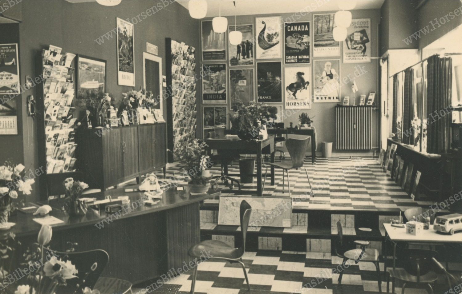 Interiør fra Horsens Rejsebureau, Kattesund 3-5. Ses 1. gang i vejviseren 1959-60. På samme adresse ses også Østjydsk Rejsebureau som iflg. vejviseren 1958 lå på Slotsgade 20. Billedet er formentlig fra omkring opstart i de nye lokaler. (Der er et kort under adressen Kattesund 5 på hjemmesiden hvor det fremgår at det er fra 1956 hvilket ikke passer medmindre det er fra Østjydsk Rejsebureau og flyttet med til den ny adresse.) Udlåner Frank Miller.