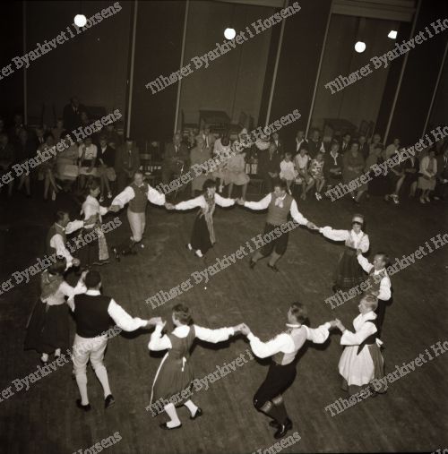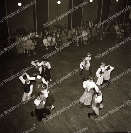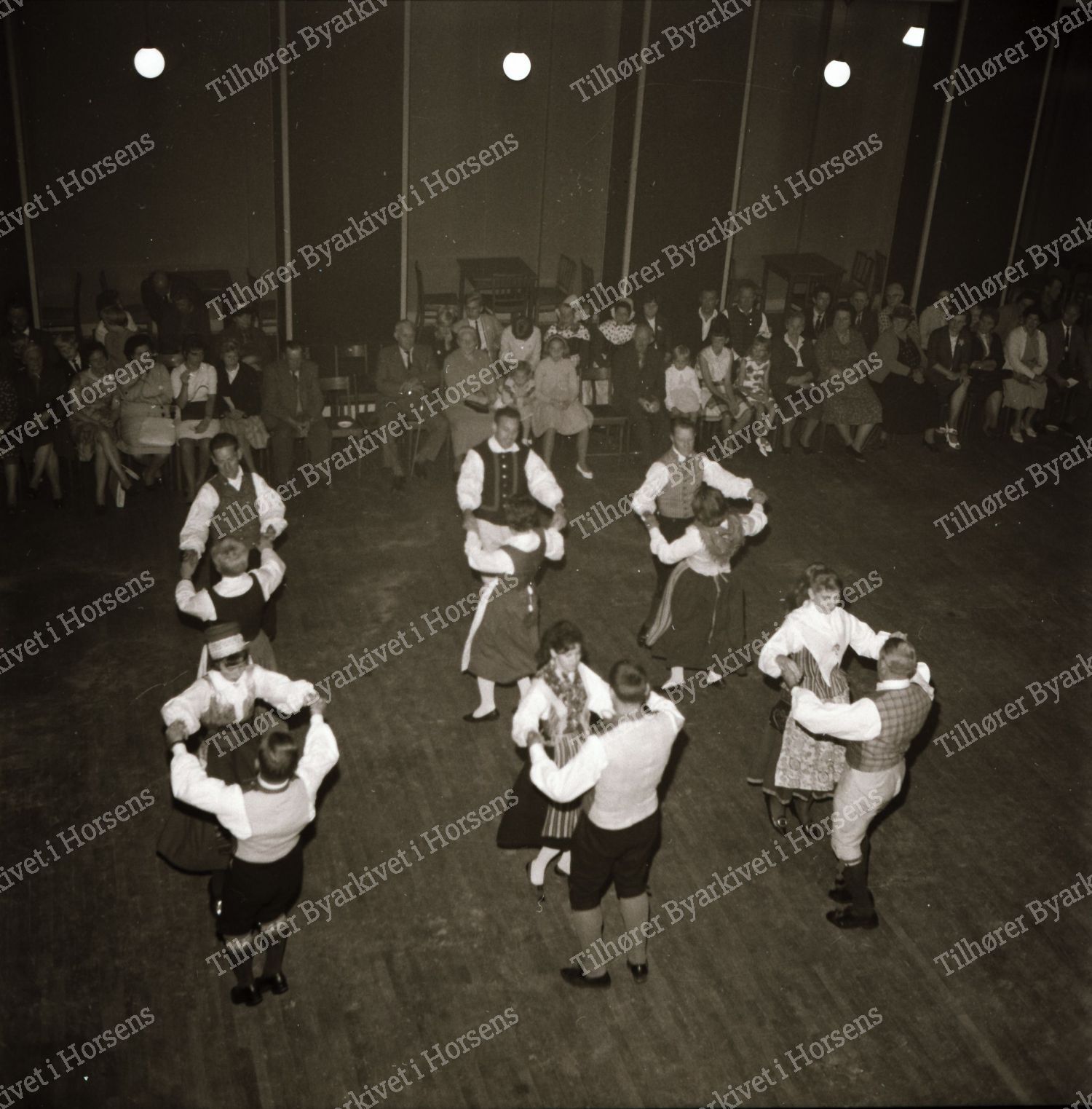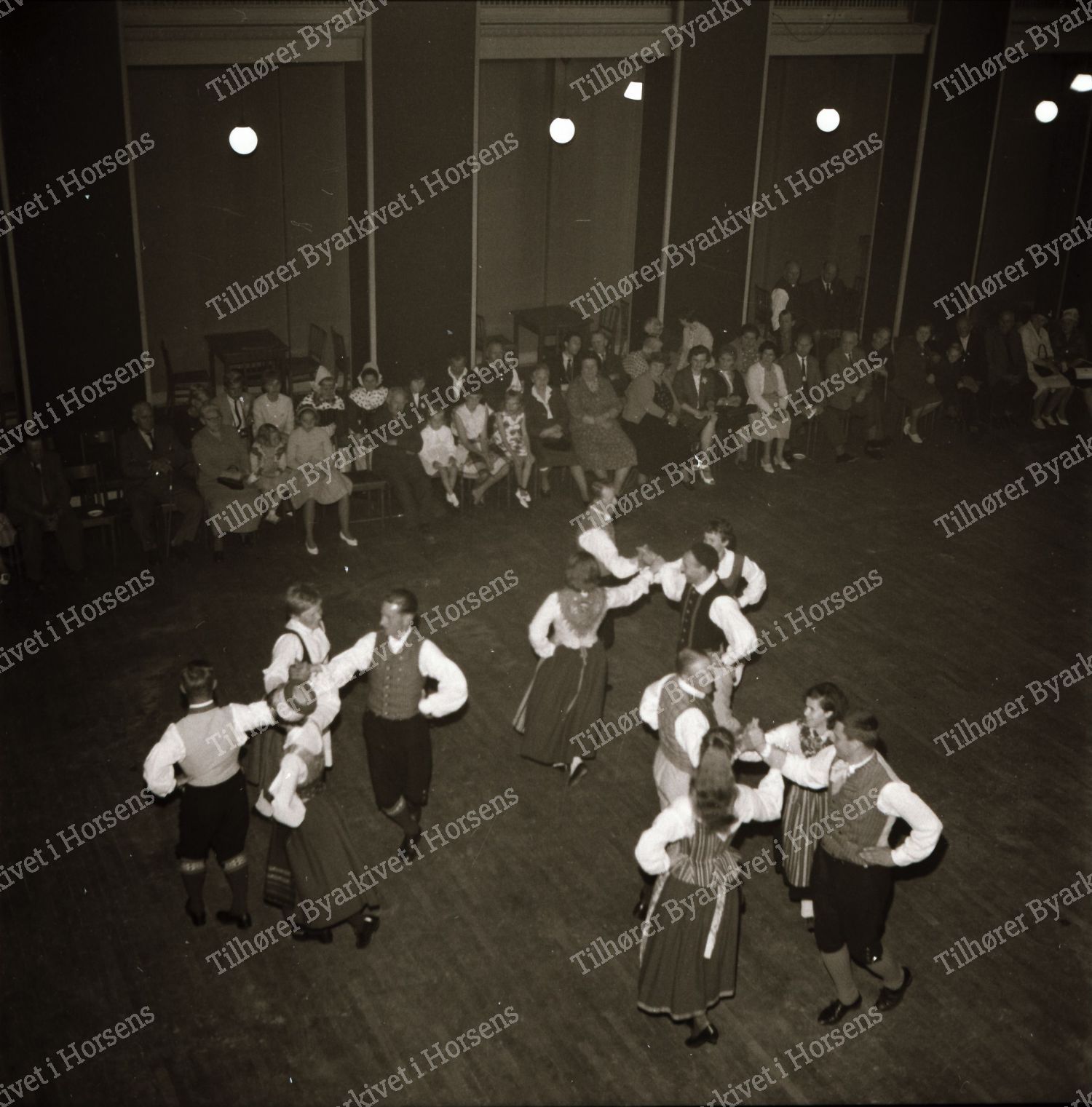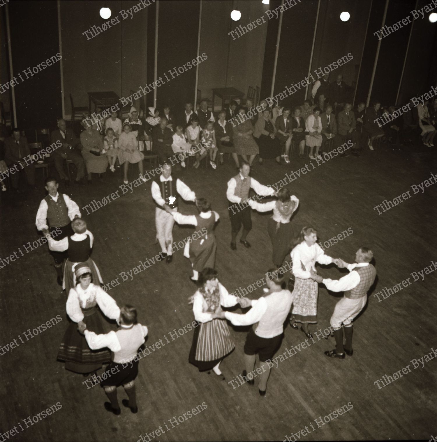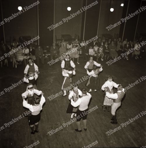 32/64. Folkedansere fra bla Falkenberg til stævne i Forsamlingsbygningen. HF 3/8-64.