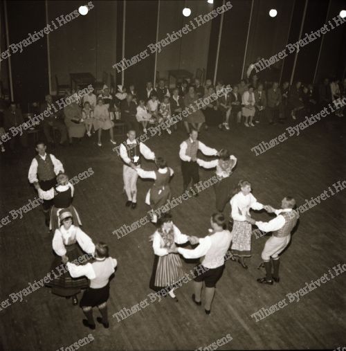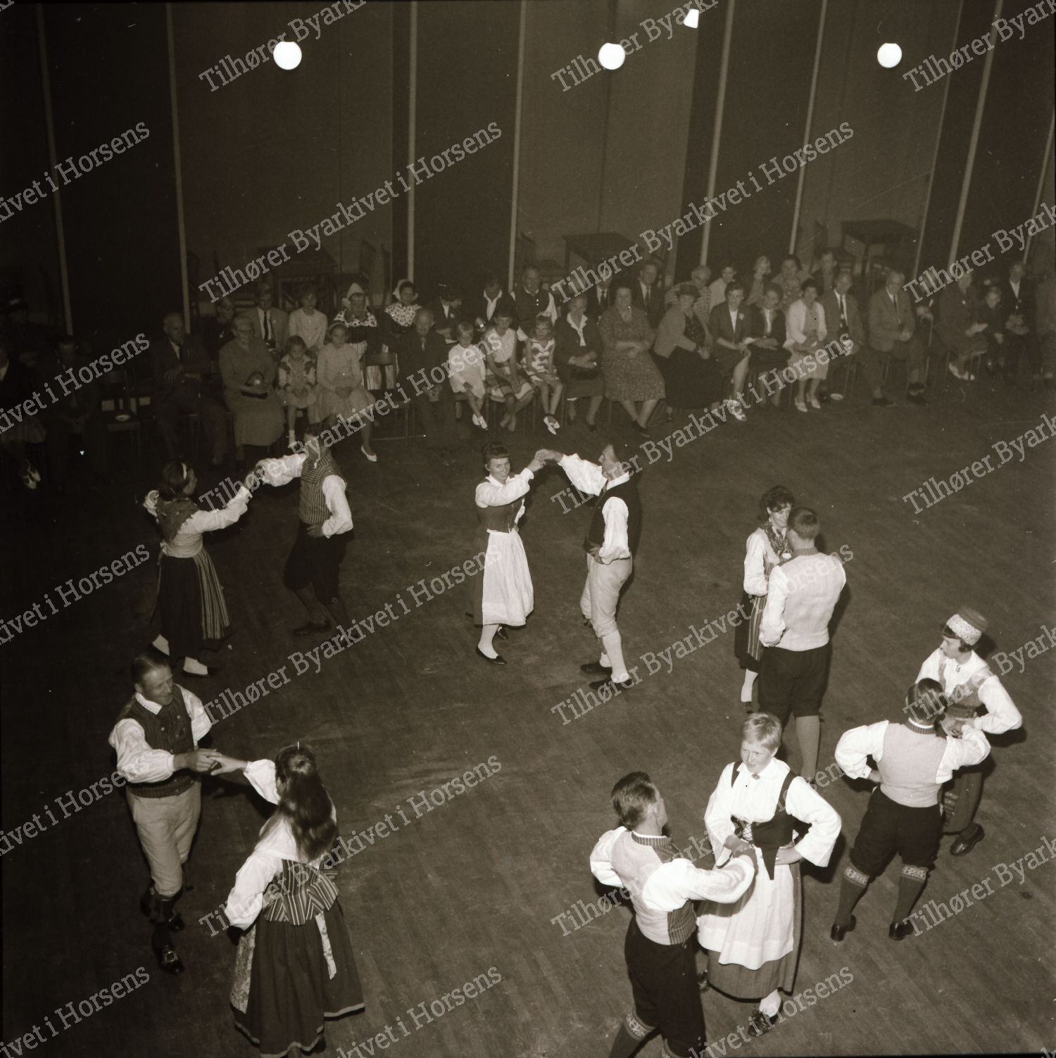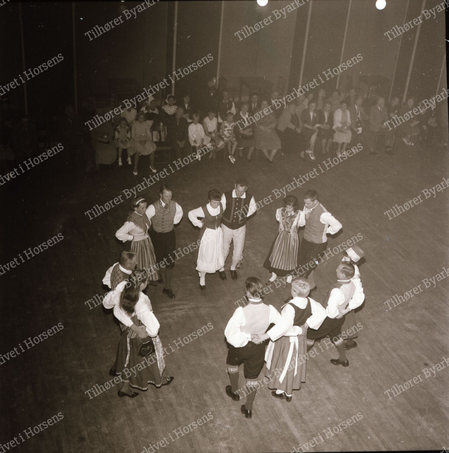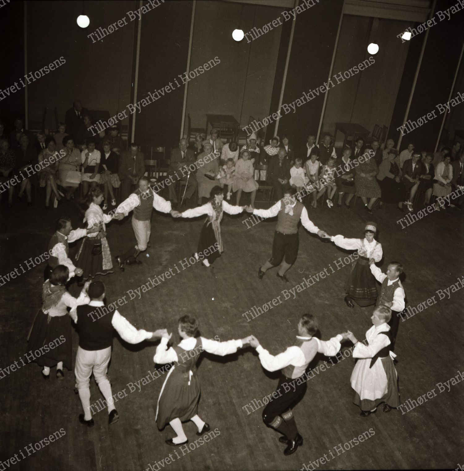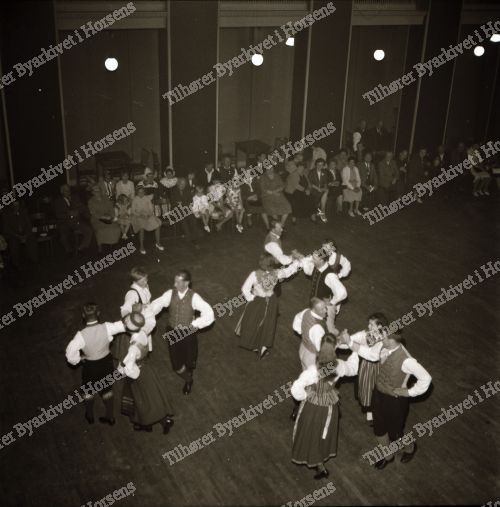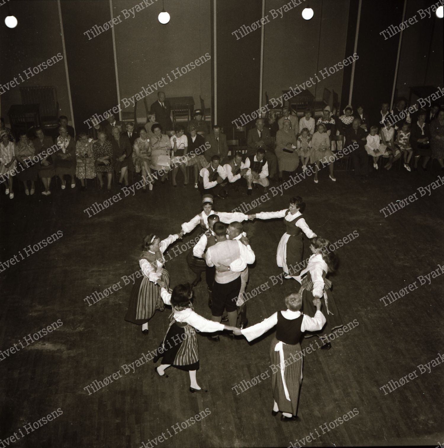 32/64. Folkedansere fra bla Falkenberg til stævne i Forsamlingsbygningen. HF 3/8-64.