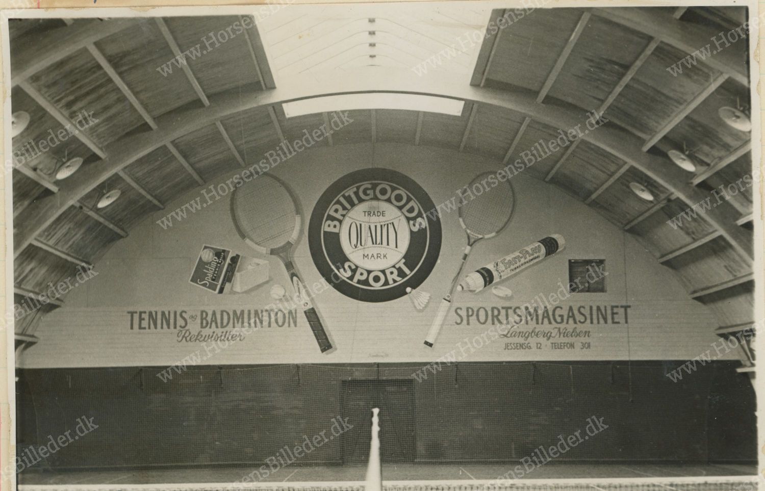 Billede fra tennishallen. Reklame på bagvæggen i tennishallen. Annonce tegnet i 1947 for 3 år. Pris kr. 500,00. Udlåner Aase Langberg.