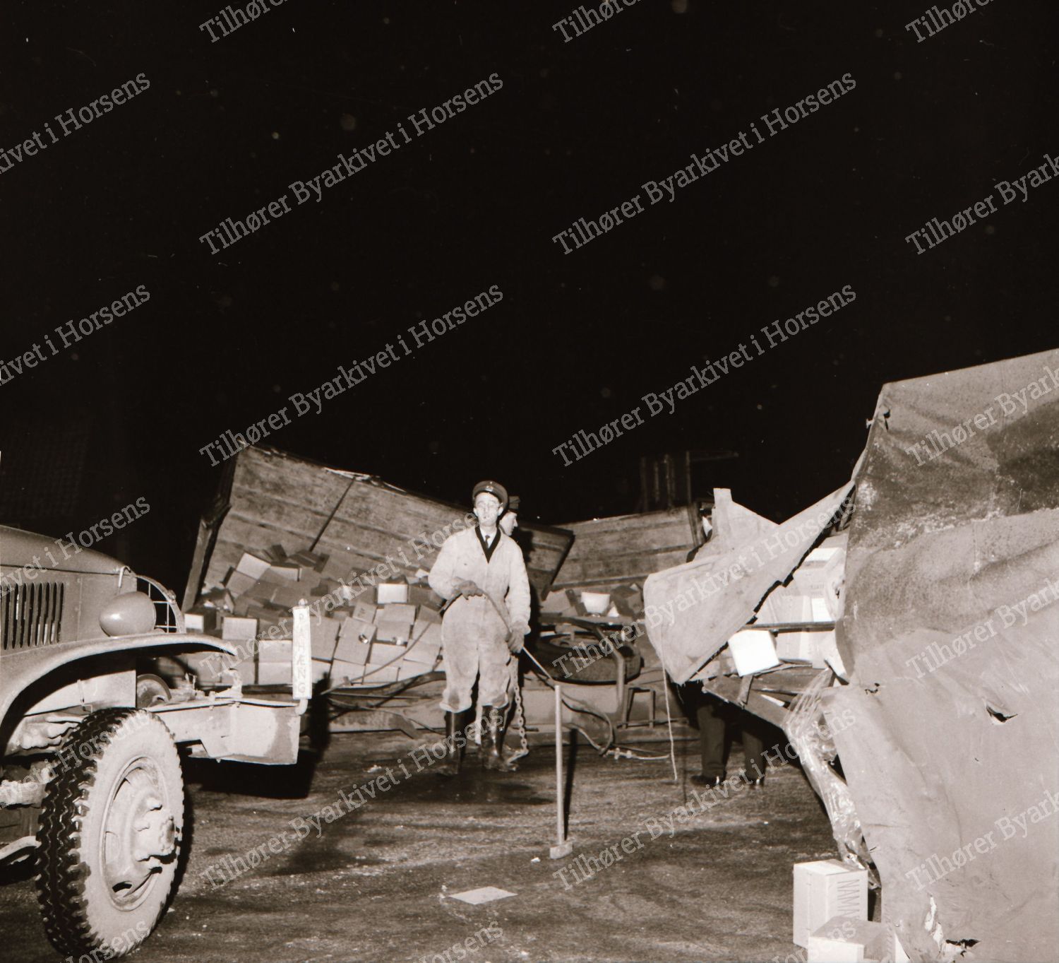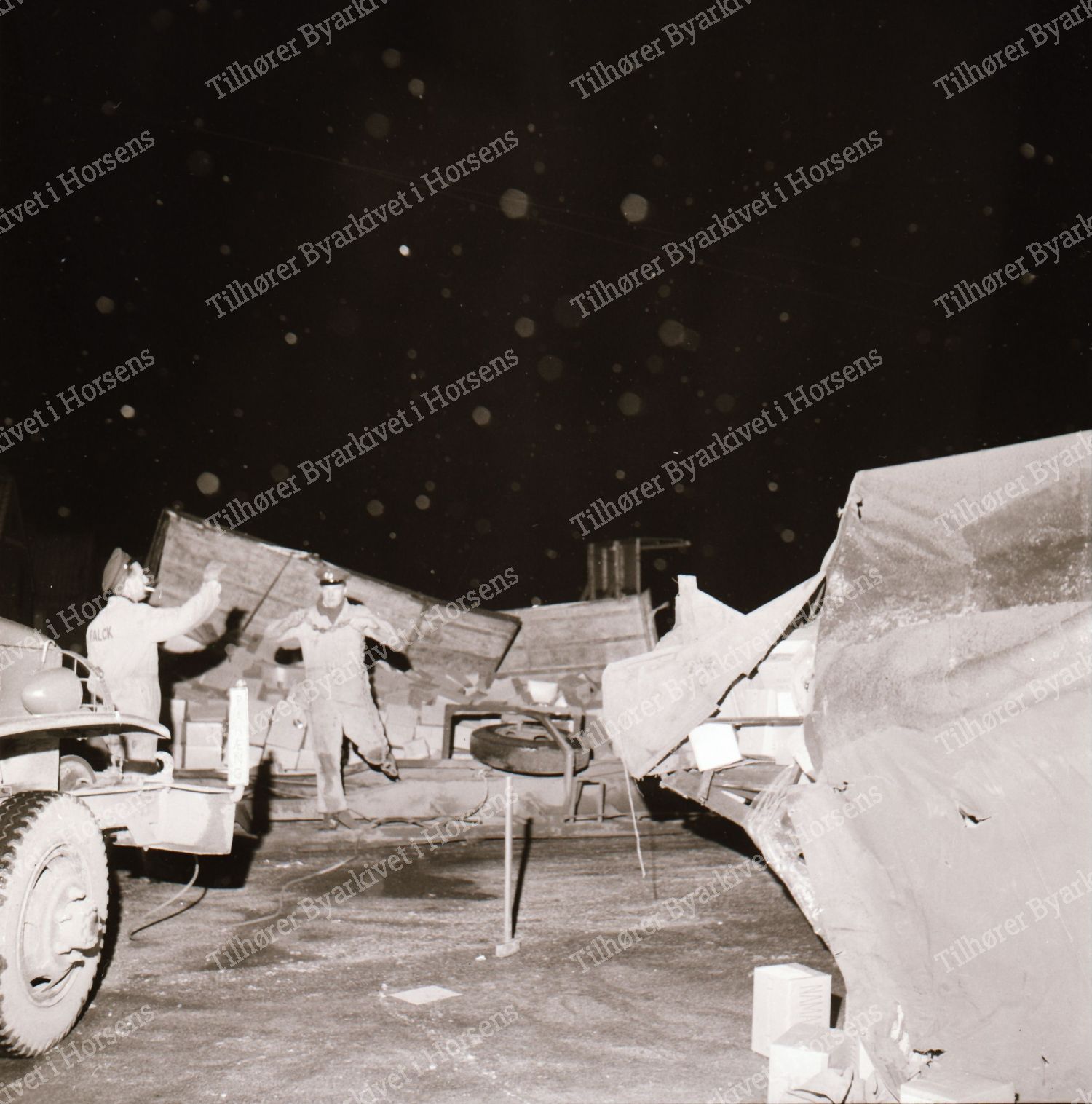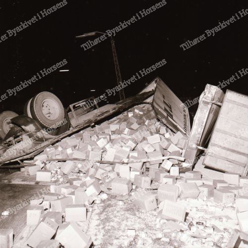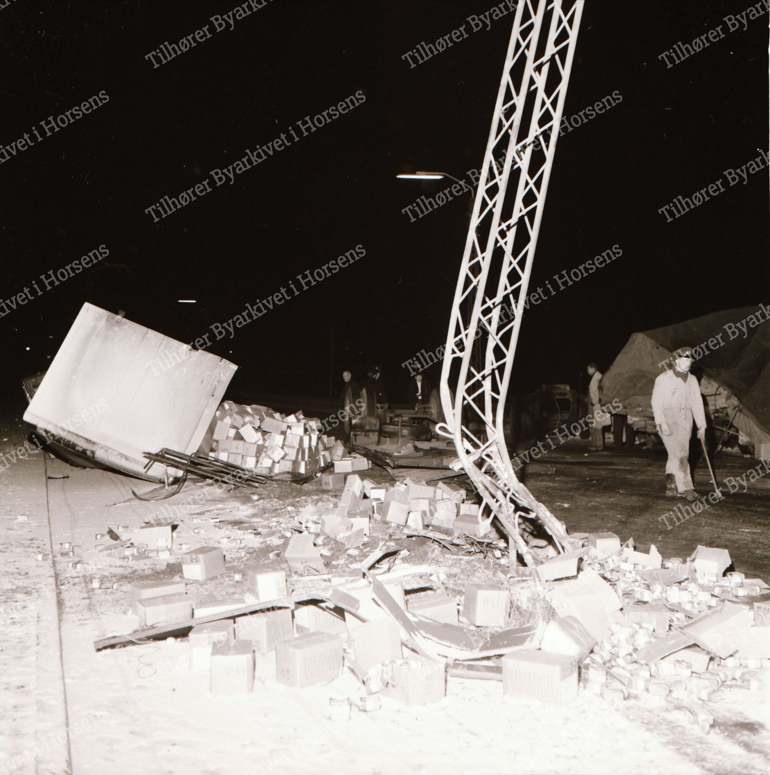 49/64. Lastvogn lastet med skinker kørte i aftes galt på Nørrebrogade pga det glatte føre. HF 4/12-64.