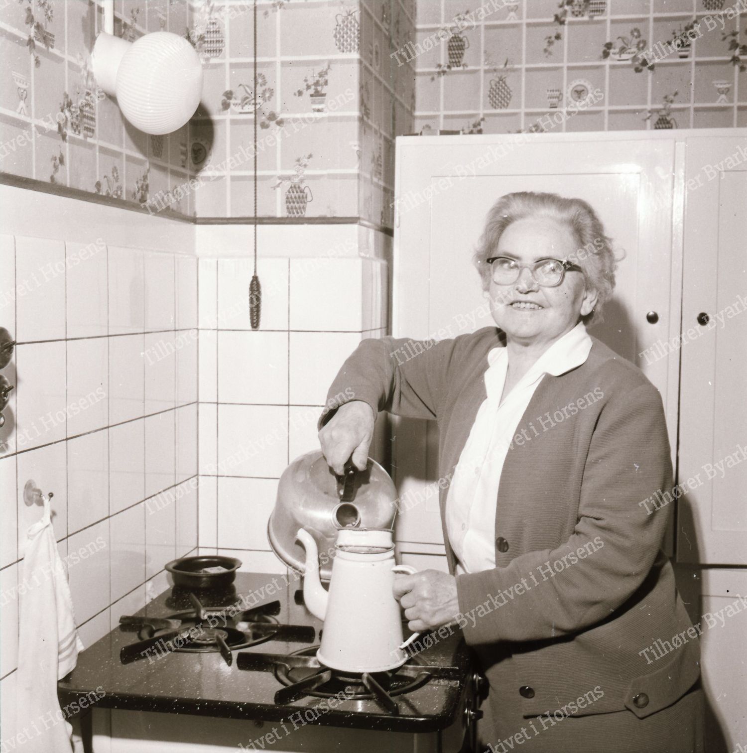 33/64. Lørdag den 15. august kan frk Kirstine Therkelsen fejre 50 årsdagen for sin ansættelse som husbestyrinde hor tidligere damefrisørinde, fru Mary Hansen, Nørregade 21. HF 11/8-64.