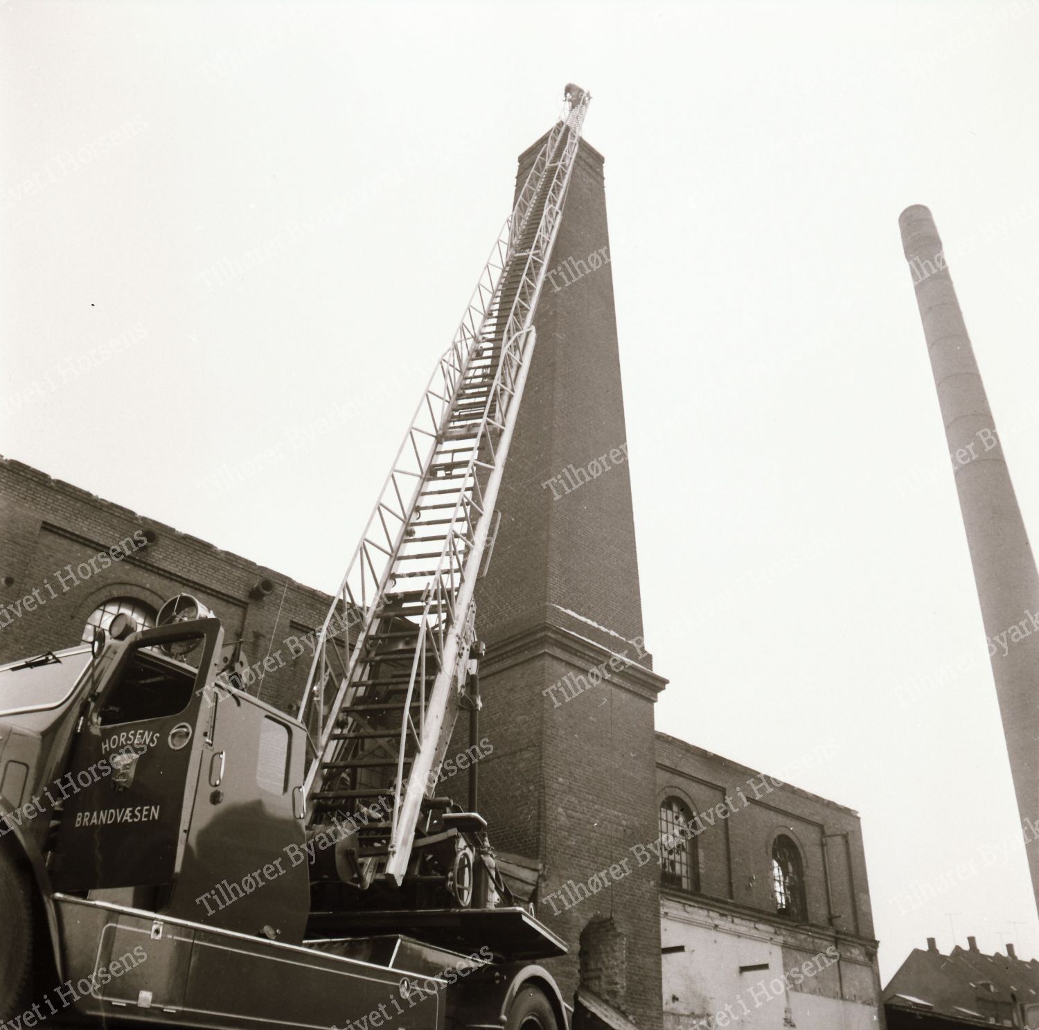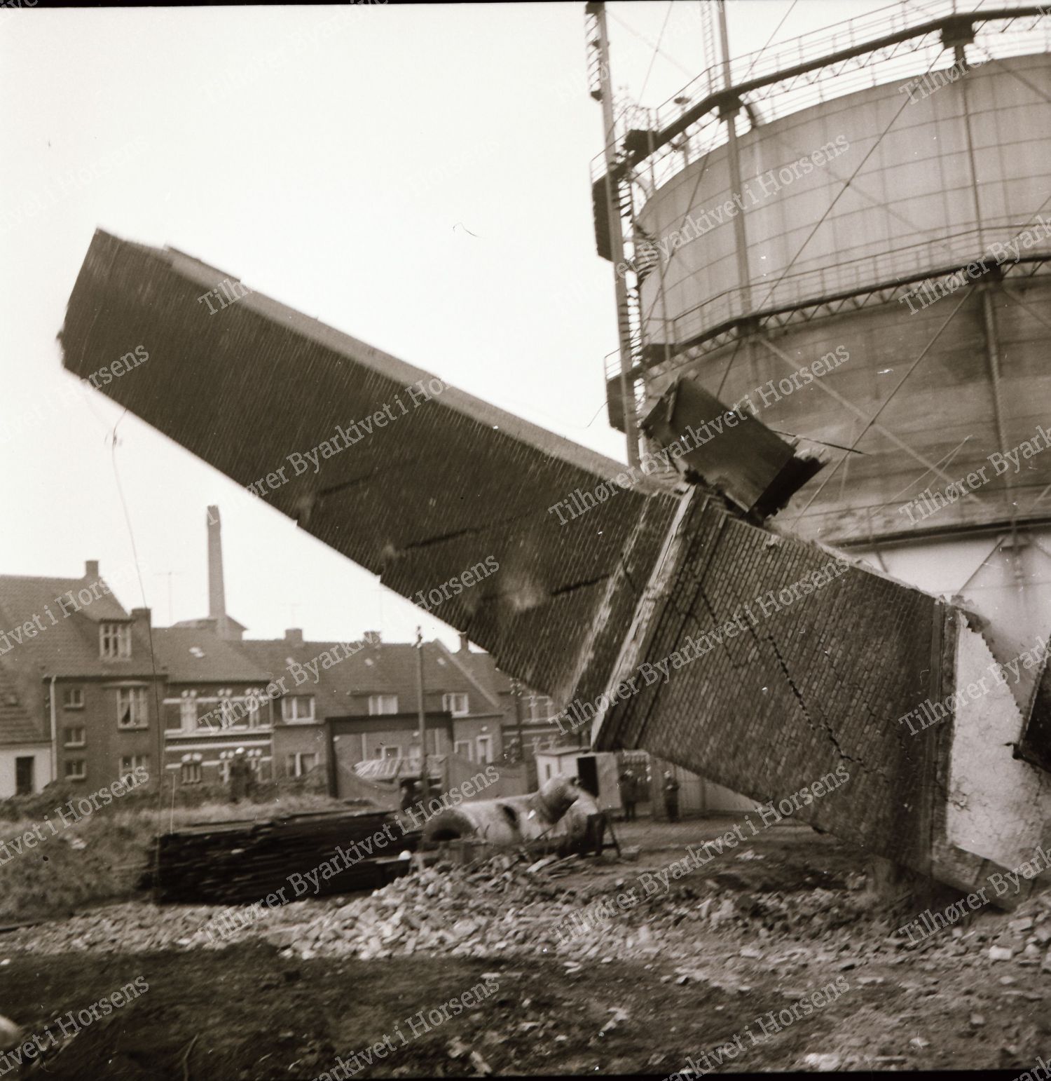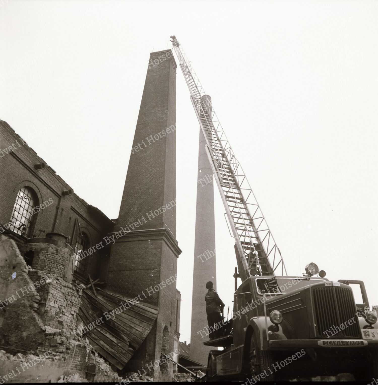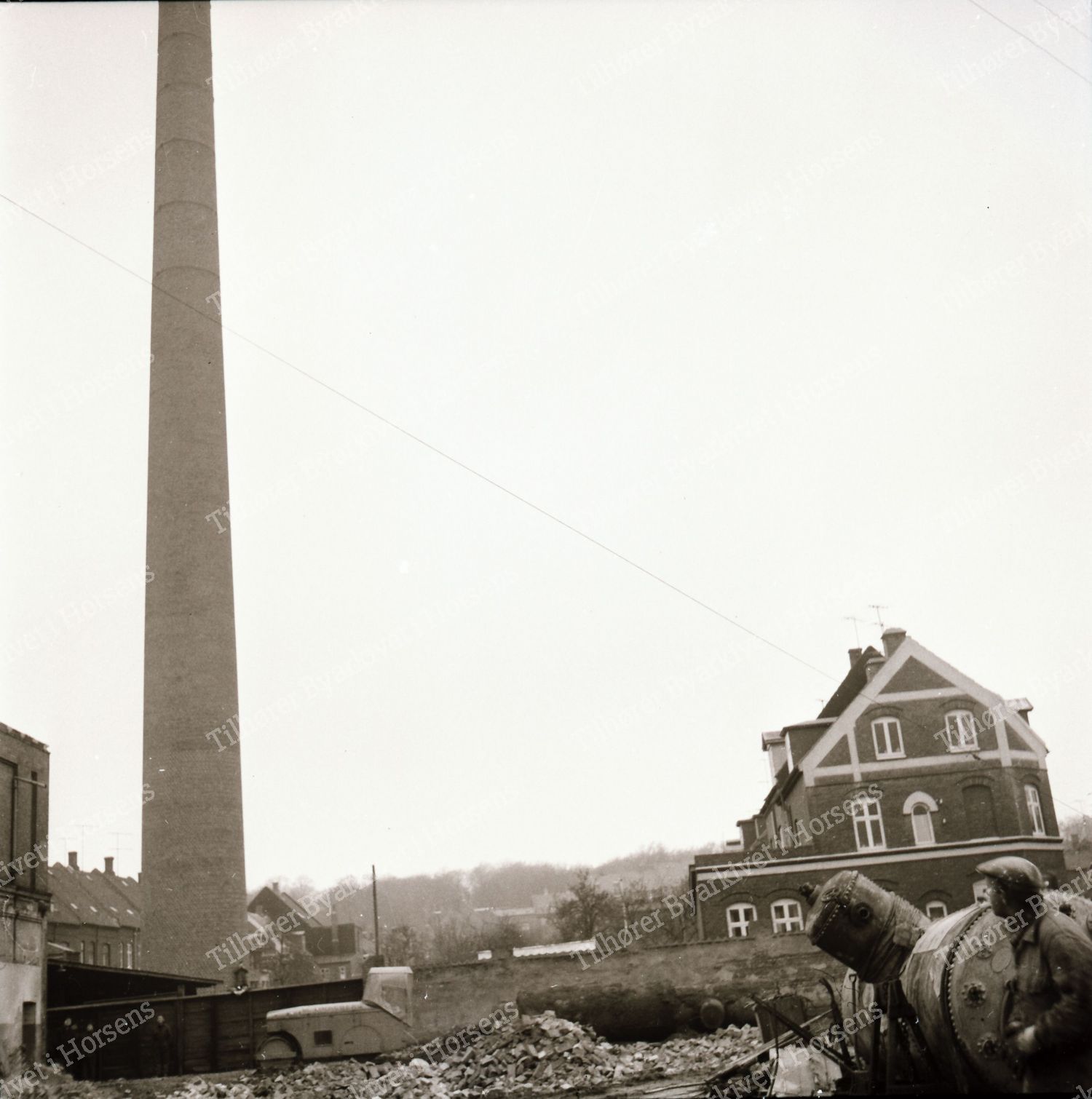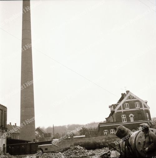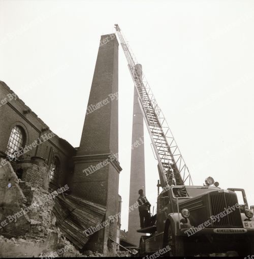 4/64. I går ved 16-tiden væltede den gamle tjærefabriks skorsten efter 3 forsøg. HF 24/1-64.