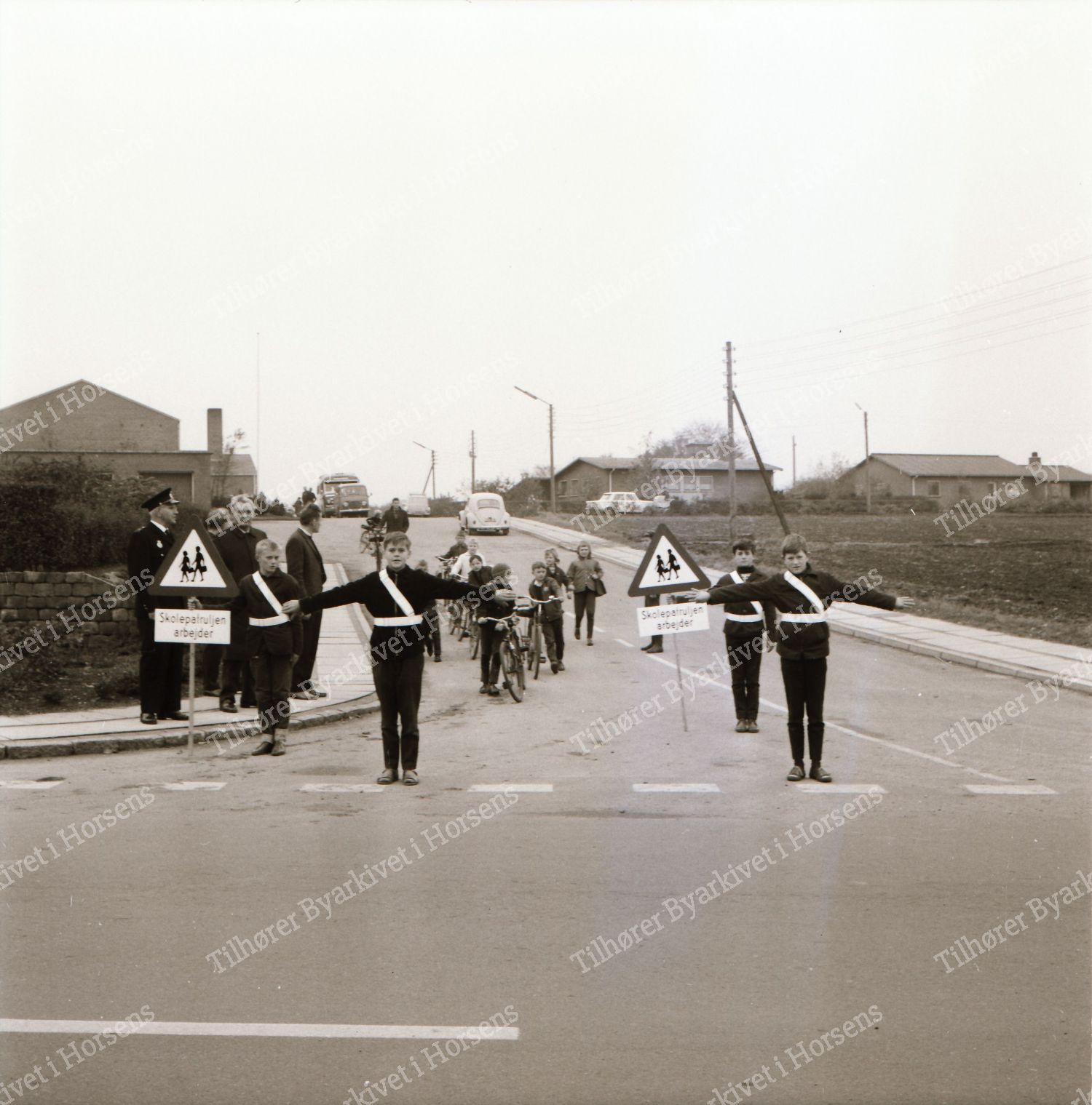44/64. 19. skolepatrulje i Horsens politikreds. Oprettet ved Tamdrup kommunes skole i Lund og for første gang i funktion i går. HF 30/10-64.