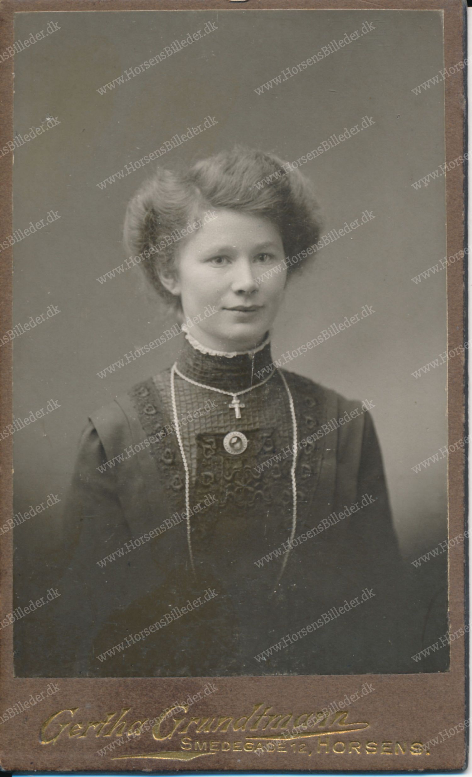 Fotografen Gertha Mary Grundtmann født 19/1-1867 og død 21/6-1937. Ankom 1893 fra Odense. frem til ca 1915 havde hun atelier på adressen Smedegade 14, derefter Smedegade 12. Udlåner Jan Østergaard Andersen. På billedet står: Skolekammerat fra seminariets børneskole Ryesgade Horsens. MArtha Madsen. Samme familie 0010. Udlåner Jan Østergaard Andersen.