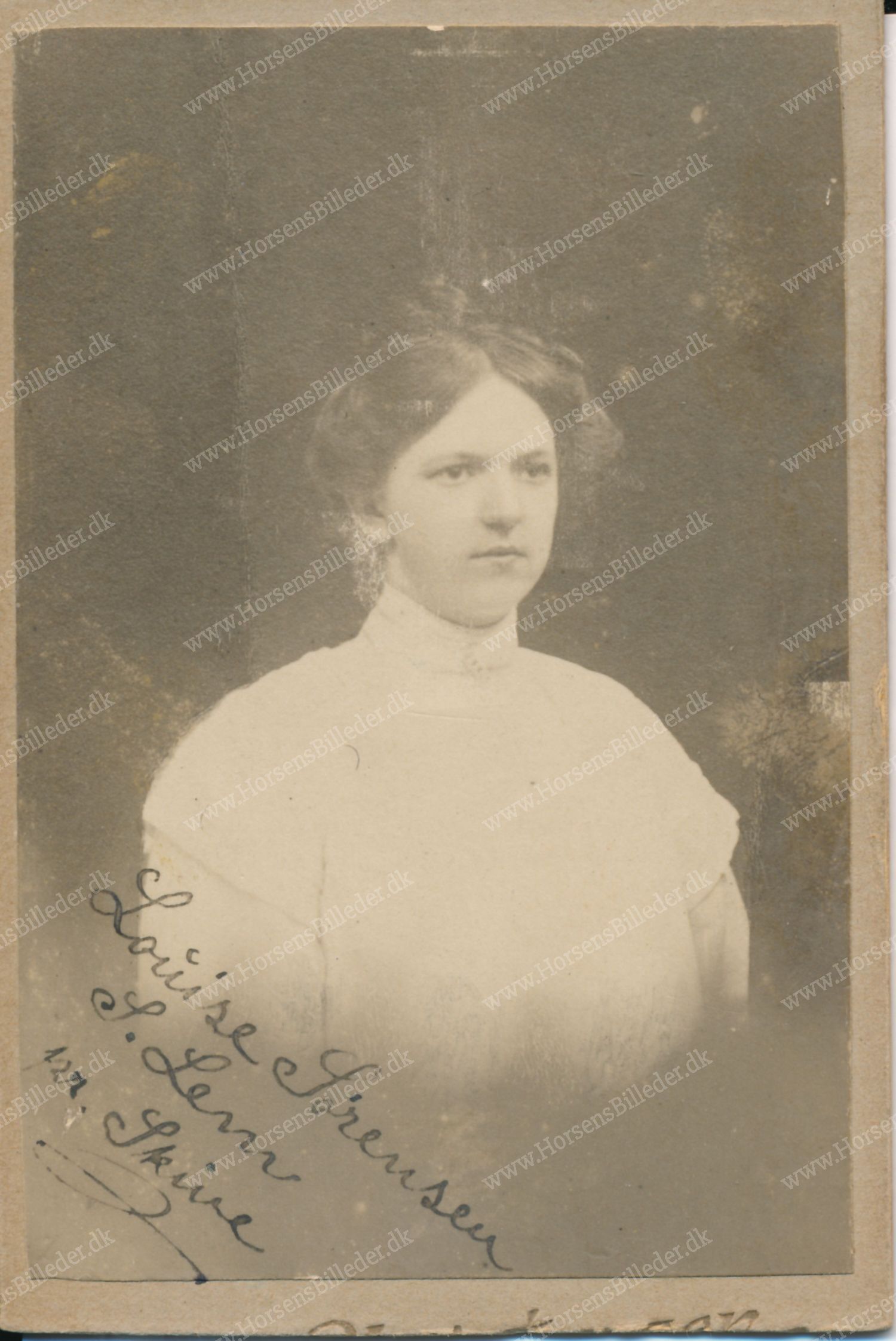 Fotografen Gertha Mary Grundtmann født 19/1-1867 og død 21/6-1937. Ankom 1893 fra Odense. frem til ca 1915 havde hun atelier på adressen Smedegade 14, derefter Smedegade 12. Udlåner Jan Østergaard Andersen. På billedet står:Louise Sørensen, f. Lem pr. Skive. Født den 7. september 1887. Død den 7. november 1911. 24 år. Samme familie 0010. Udlåner Jan Østergaard Andersen.