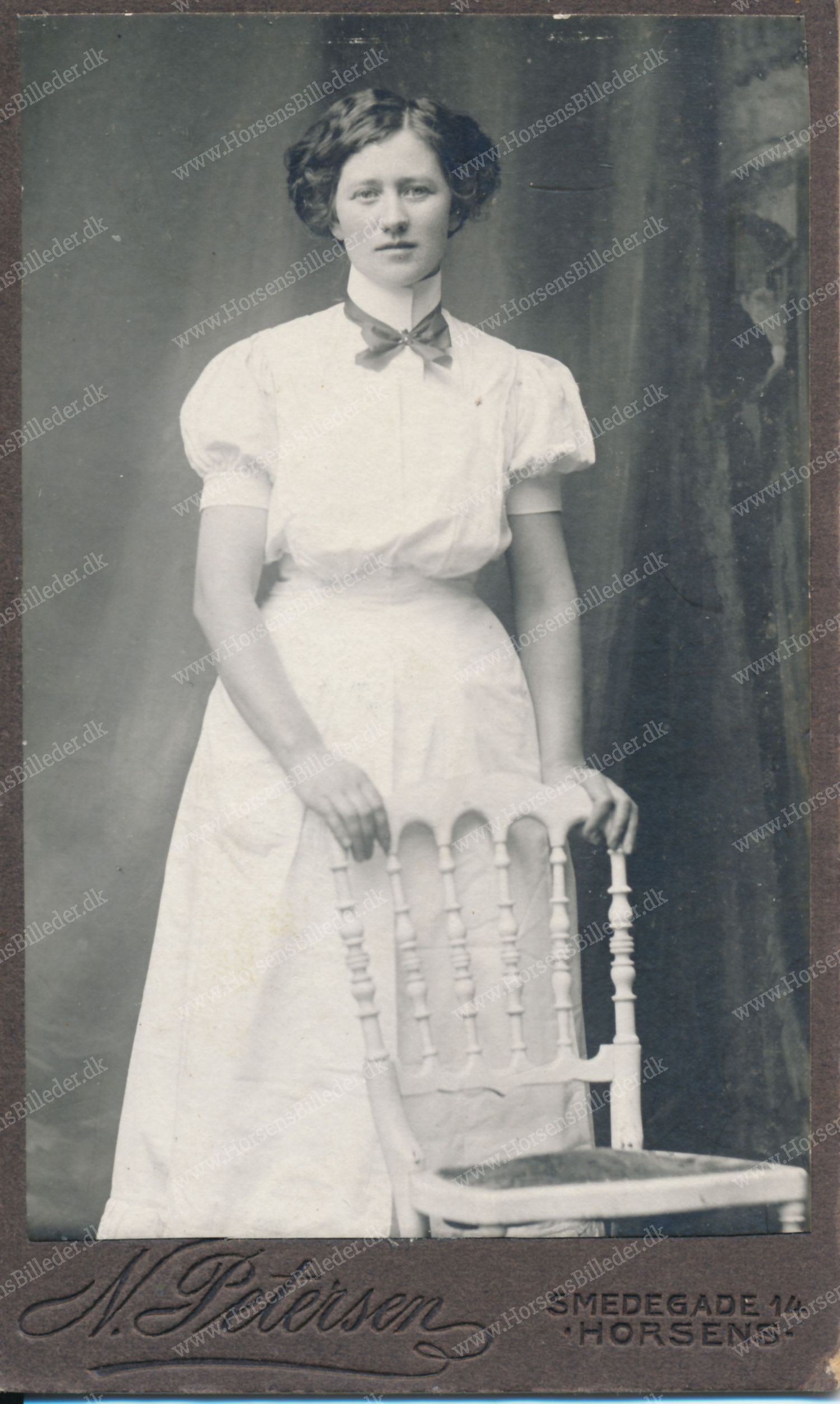 Fotoet er taget hos fotograf N. Petersen, Smedegade 14. ca. 1911 og frem. Udlåner Jan Østergaard Andersen. På billedet står: Sygeplejerske frk. Jespersen kommunehospitalet, Horsens. Samme familie 0010.