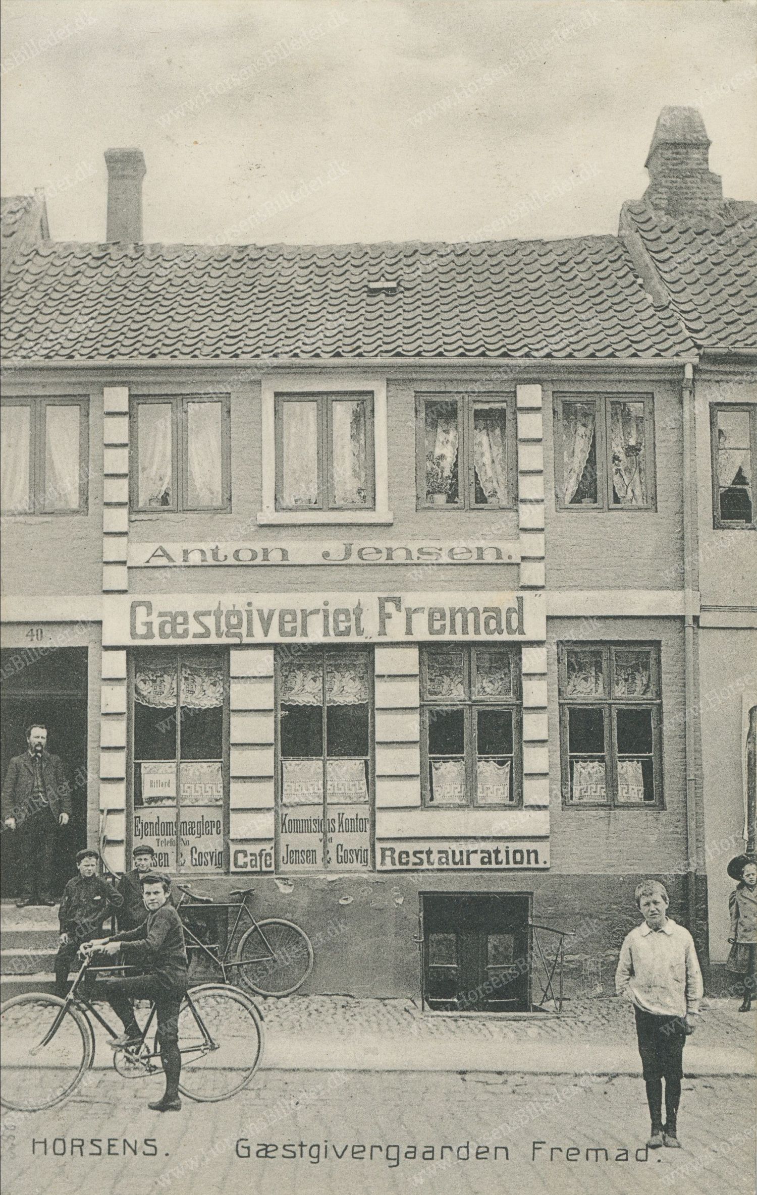 Her drev Anton Jensen Gæstgiveriet Fremad. Formentlig ham selv der står i døråbningen. Postkort Frank Miller.