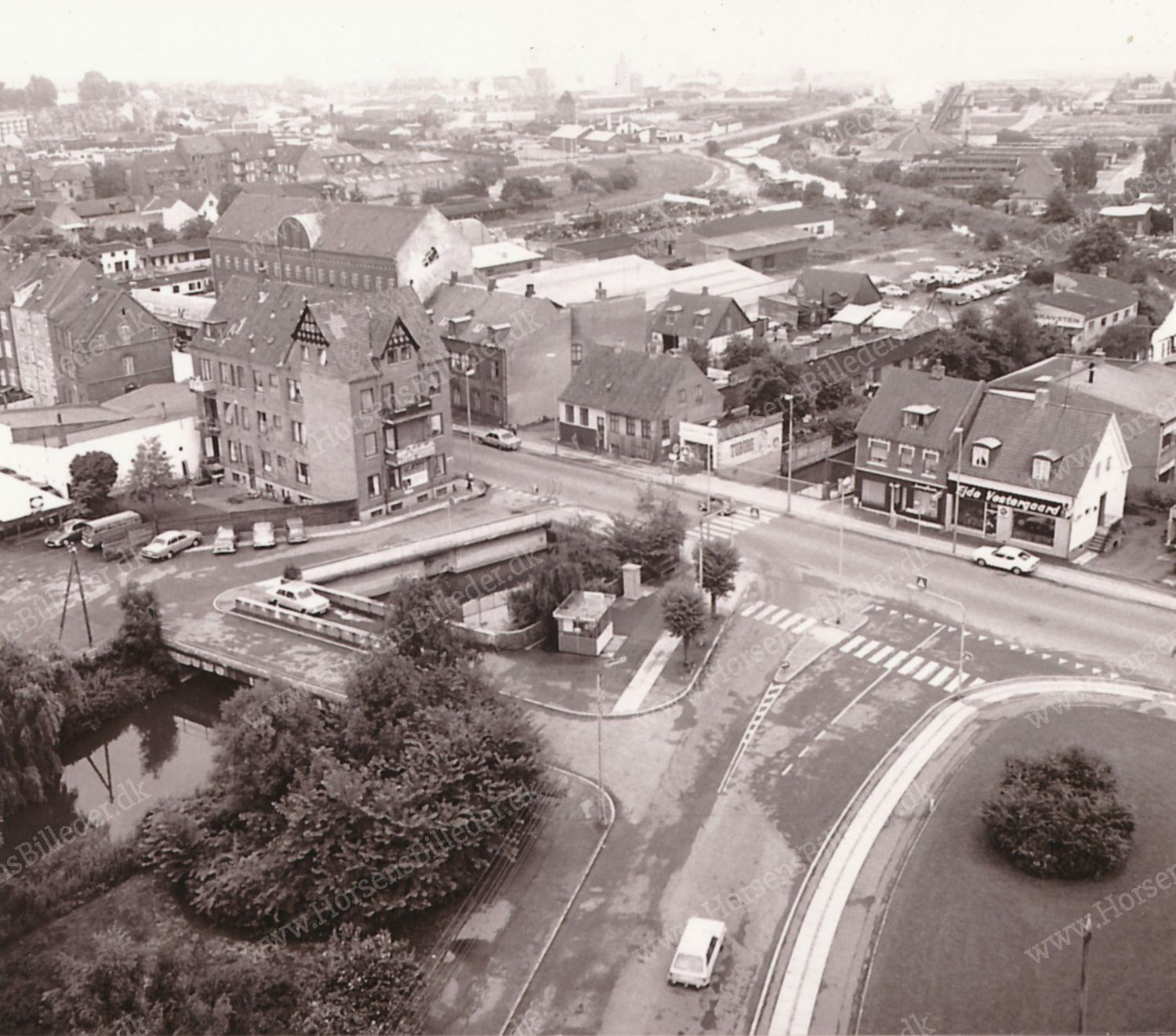 Bygholm Parkvejs udmunding i Sønderbrogade ved Røde Bro over Bygholm å, taget fra den nybyggede Sønderbro Kirkes tårn. Den gamle jernbanebro ses også. Udlåner Jan Østergaard Andersen.