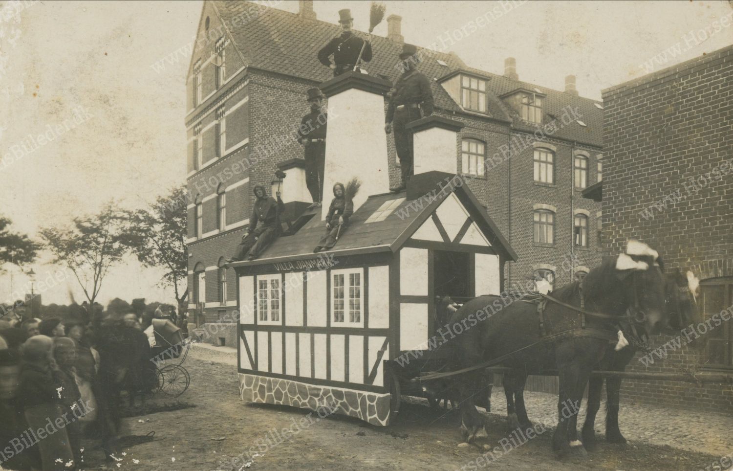 Sønderbrogade 55 set fra Fynsgade med skorstensfejer P. M. Olesen i toppen af skorstenen. Formentlig i forbindelse med fagenes fest eller rundskuedage? Postkort Frank Miller.