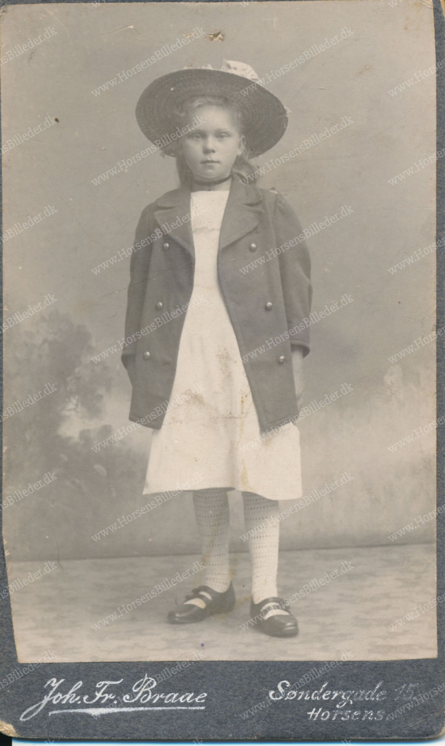 Fotografen Johan Frederik Braae Født 26/11-1840 og død 27/4-1915. Havde gennem tiden til huse på følgende adresser: 1877 Torvet 577, ca. 1880 kaldet Torvet 2 og frem til 1896. Han annoncerede 12/11-1896 i Århus Stifttidende at han havde solgt sit atelier Torvet 2 i Horsens. I slutningen af oktober 1896 åbnede han nyt atelier Søndergade 32 i Århus. Fra 1897 - 1899 findes han Søndergade 44 og fra 1899 - 1915, Søndergade 15. Udlåner Jan Østergaard Andersen. På billedet står: Emils - Vitus og Ebbas moster Alma Horsens. Samme familie 0010.