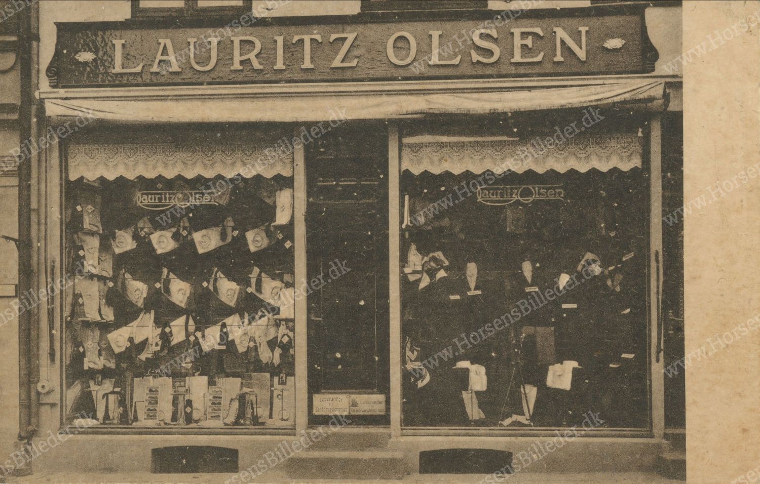 Her drev Herreekviperingshandler Lauritz Olsen forretning. Lå tidligere på Søndergade 35. Ca. år 1919. Postkort Frank Miller.