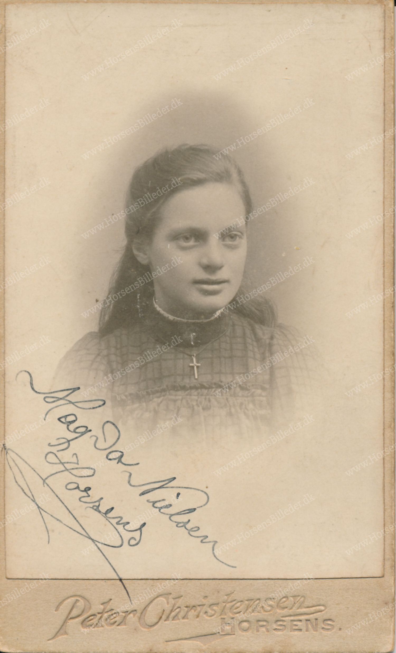 Fotografen Peter Christian Christensen født 30/5-1856 og død 20/4-1943 overtog i 1896 A. Muncks atelier i Horsens. Han fik borgerskab som fotograf i 15/11-1899. Boede fra 1890 i Berlin. Udlåner Jan Østergaard Andersen.På billedet står: Skolekammerat seminariets børne skole Ryesgade Horsens. Magda Nielsen. Død 13 år gl. Samme familie 0010.