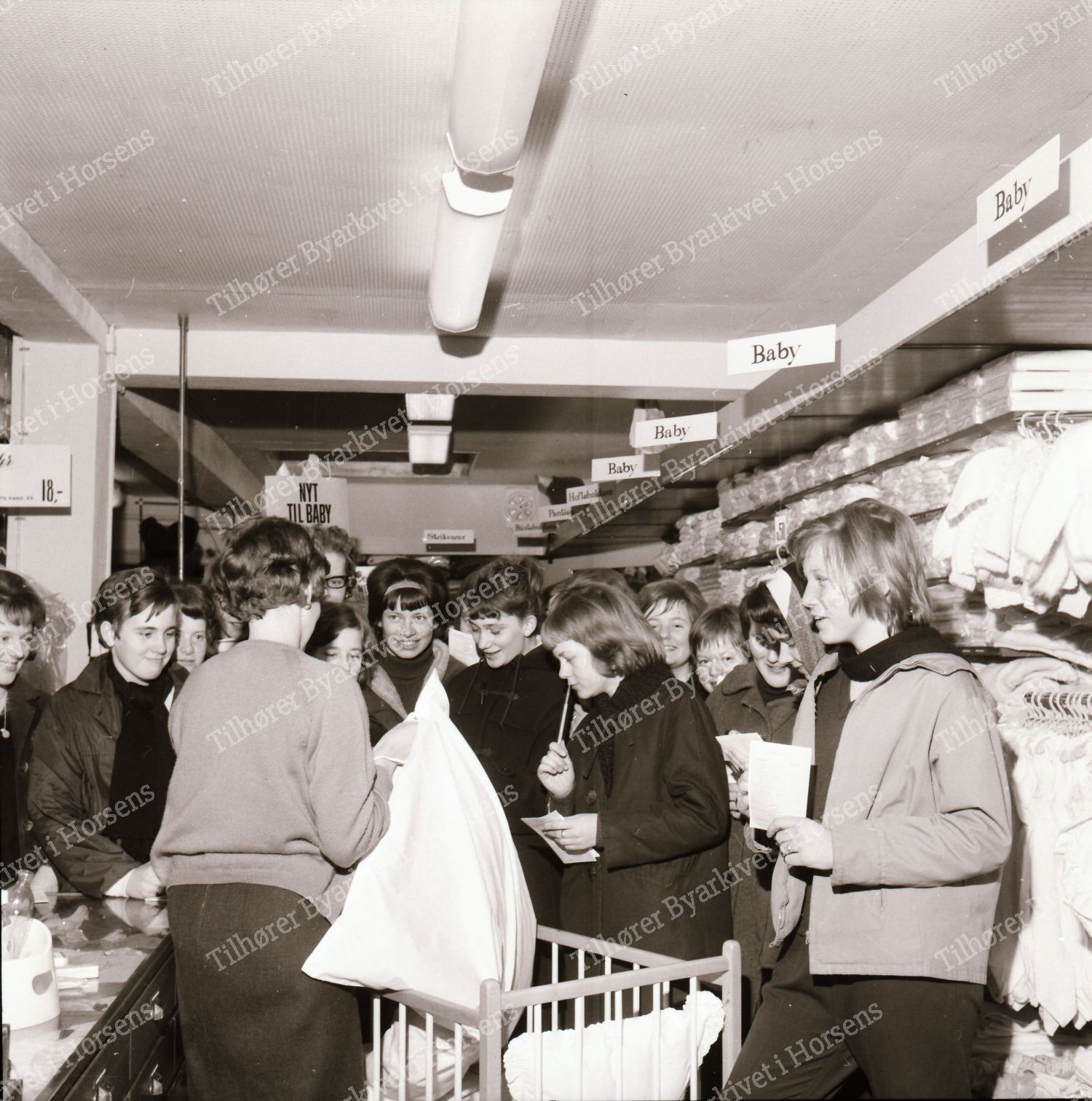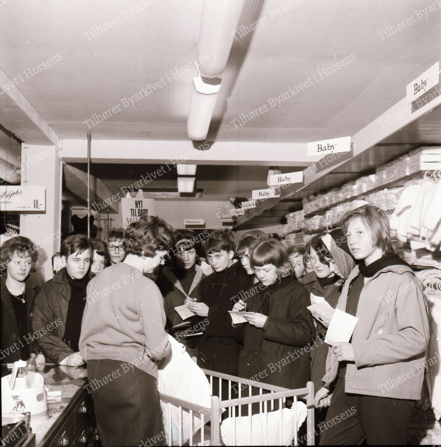 8/64. Skolepiger ser på børneudstyr hos Oscar Møller. HF 20/2-64.