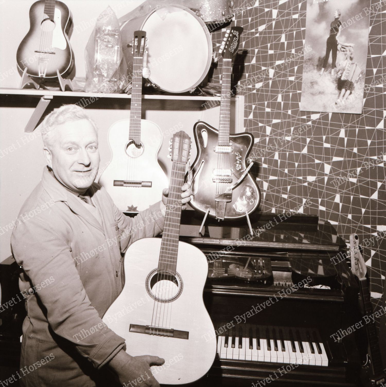 6/64. Strøgpassagen. Musikhandler O. Hjortlund, Horsens, præsenterer forskellige guitarmodeller. HF 6/2-64.