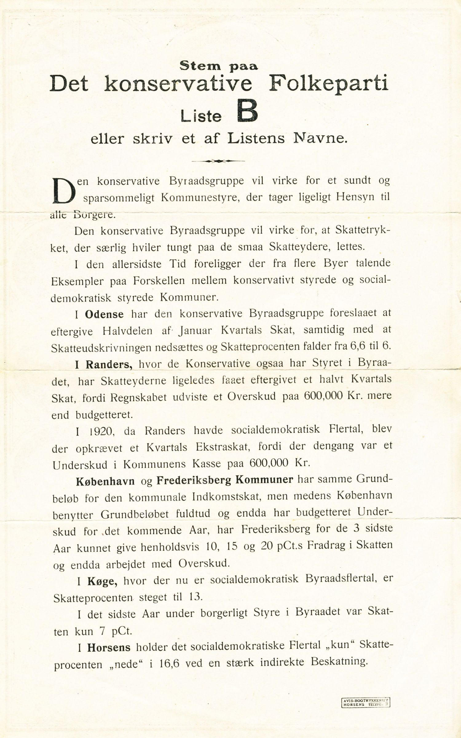 Flyers. Det Konservative Folkeparti. Formand Carl Marenus Møller. Han var redaktør og eneejer af Horsens Avis fra 1898-1919. Udlåner Jan Østergaard Andersen.