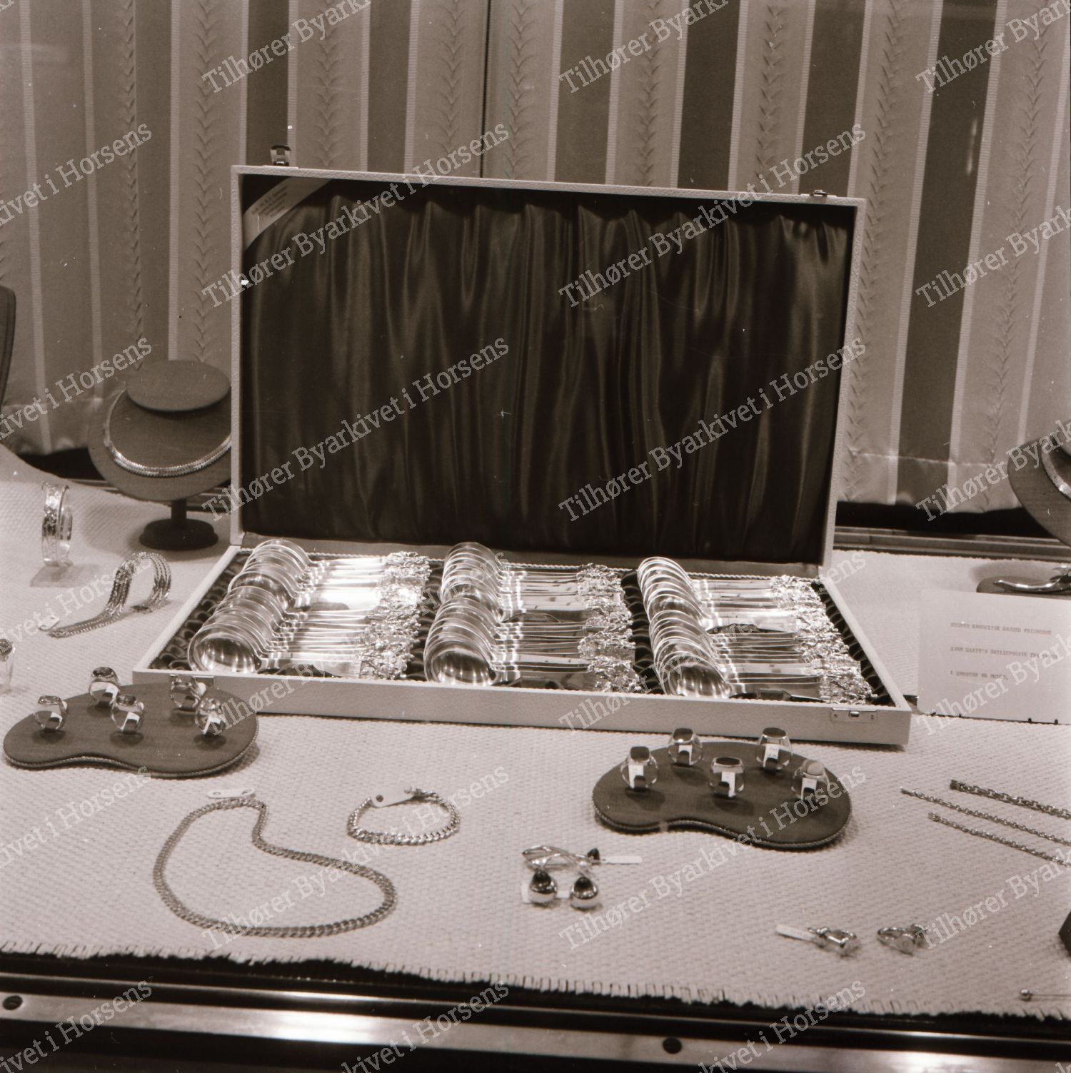 36/64. Hos guldsmed Børge Sørensen, Søndergade, står i disse dage udstillet gaven, kvinder og kvindeforeninger i Horsensby og omegn skænker prinsesse Anne-Marie i bryllupsgave. HF 31/8-64.