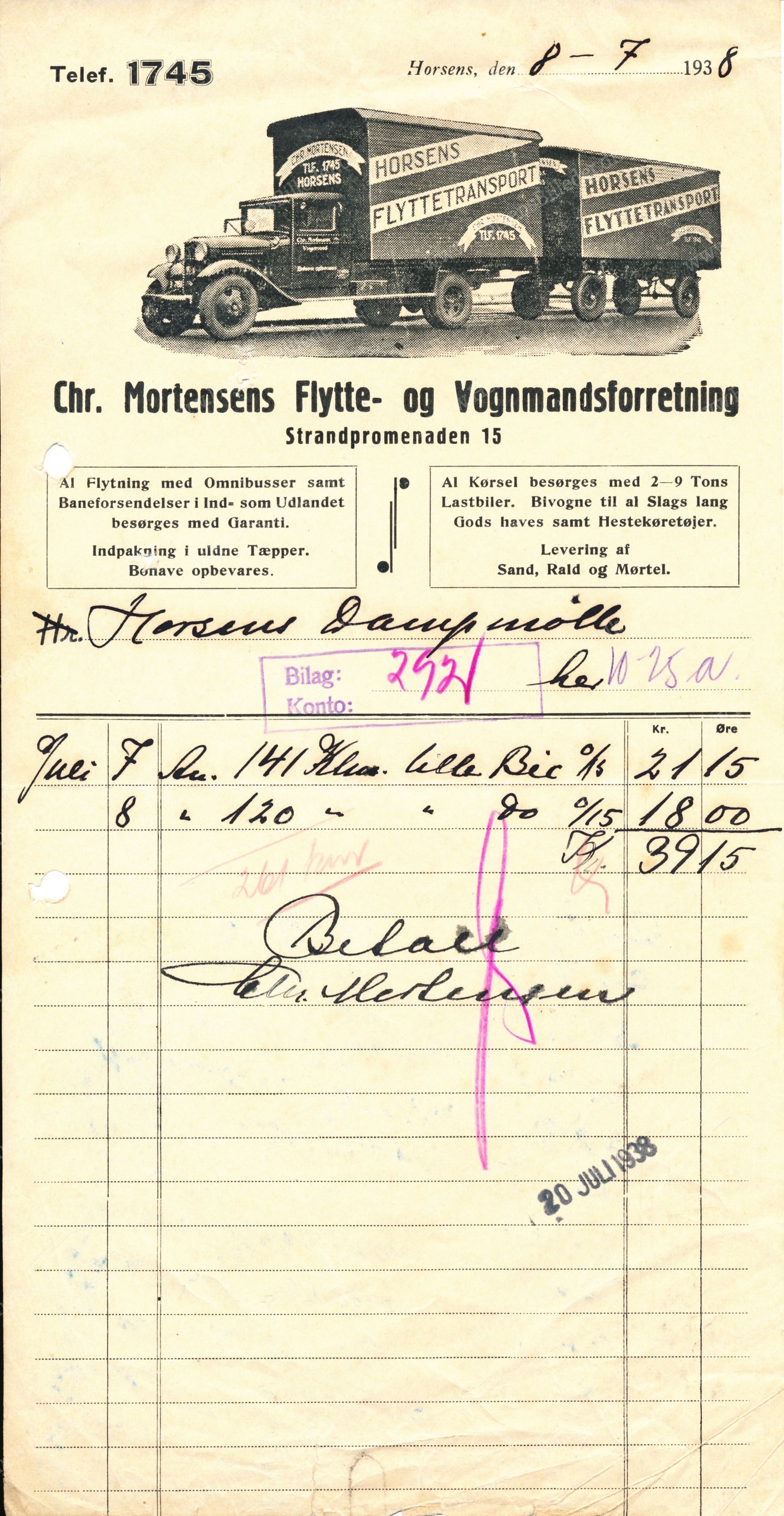 Faktura fra Chr. Mortensens Flytte- og Vognmandsforretning til Horsens Dampmølle. Udlåner Jan Østergaard Andersen.