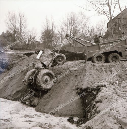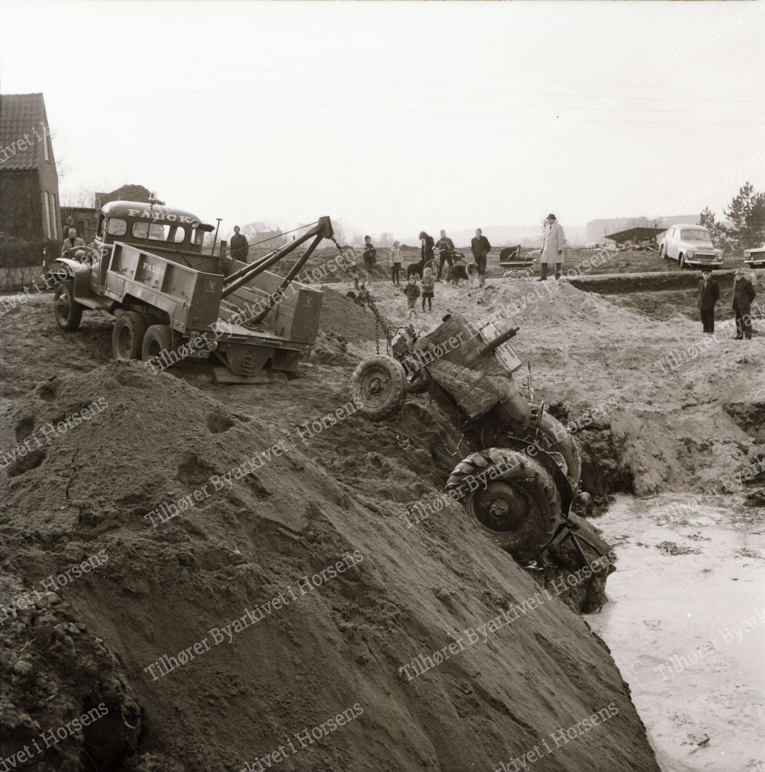 11/63. Traktoren faldt i mosen under arbejdet på den nye vej ved Stensballe. HF 10/3-64.