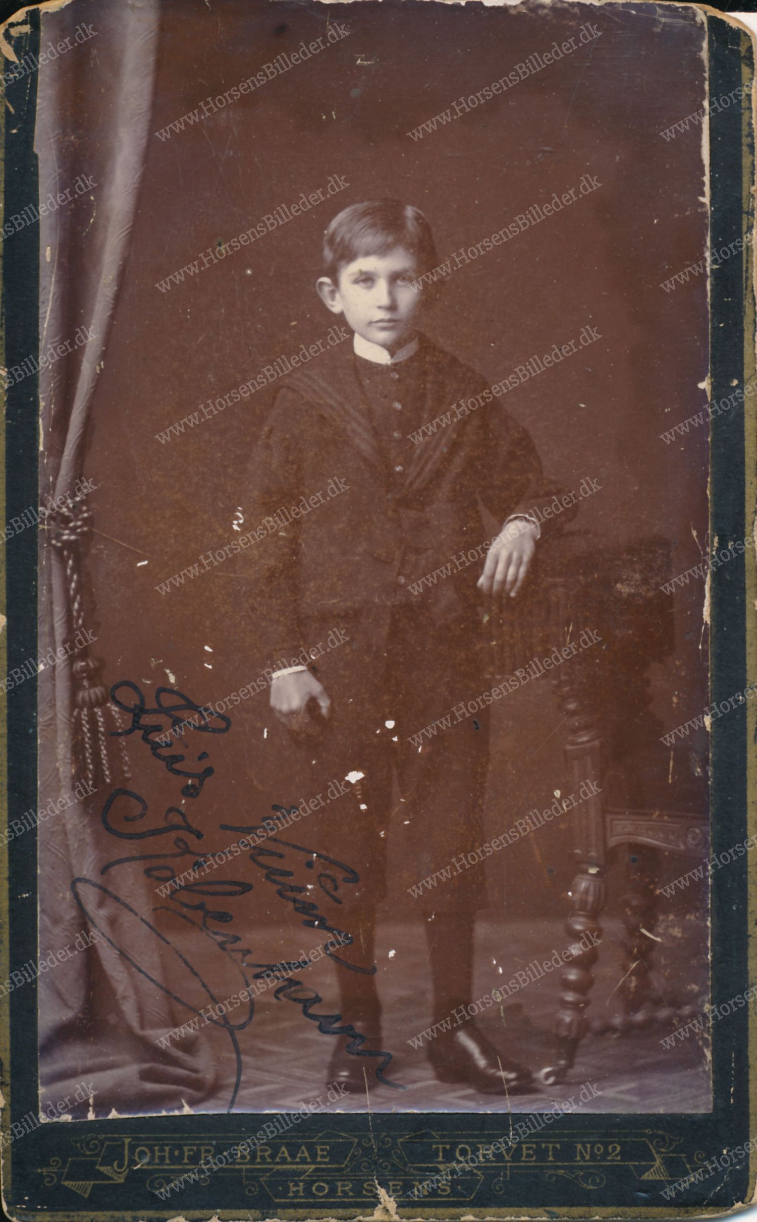 Fotoet er taget hos fotografen Johan FreFotografen Johan Frederik Braae Født 26/11-1840 og død 27/4-1915. Havde gennem tiden til huse på følgende adresser: 1877 Torvet 577, ca. 1880 kaldet Torvet 2 og frem til 1896. Han annoncerede 12/11-1896 i Århus Stifttidende at han havde solgt sit atelier Torvet 2 i Horsens. I slutningen af oktober 1896 åbnede han nyt atelier Søndergade 32 i Århus. Fra 1897 - 1899 findes han Søndergade 44 og fra 1899 - 1915, Søndergade 15. Udlåner Jan Østergaard Andersen. På billedet Står: Luis Vium. København. Samme familie 0010.