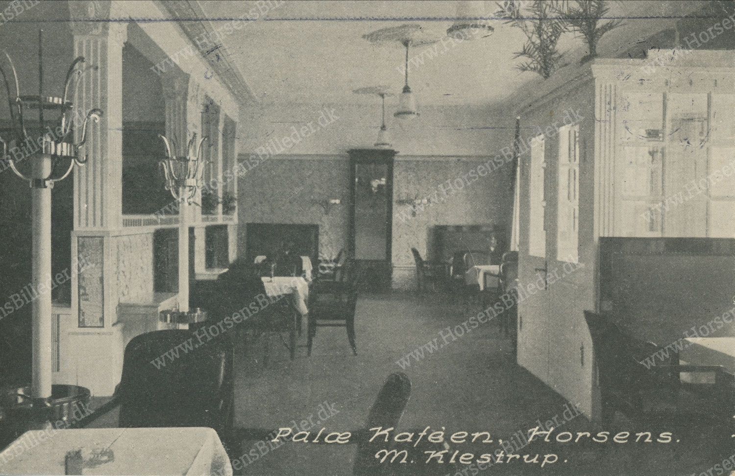 Palæ Kafeen ved M. Klestrup. Postkort Frank Miller.